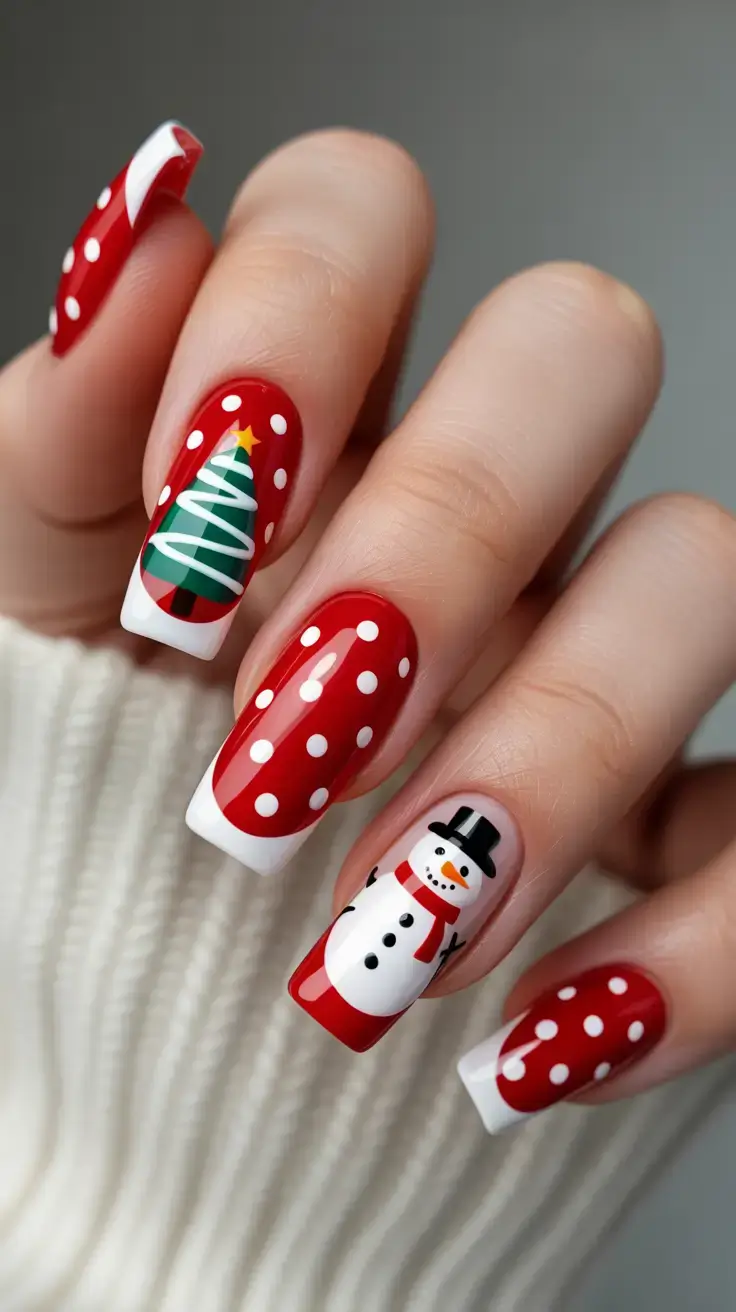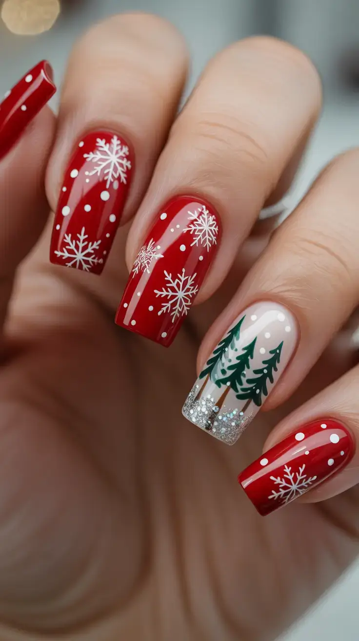Red nails covered with dots and minute flakes are saturated and collide with one clear-colored accent with tiny evergreen trees and silver drift. The general structure is in that slightly squared camp, which makes things classy to those who like their red nail designs square and narrative. It is celebratory and not screaming – heirloom-ornamental.