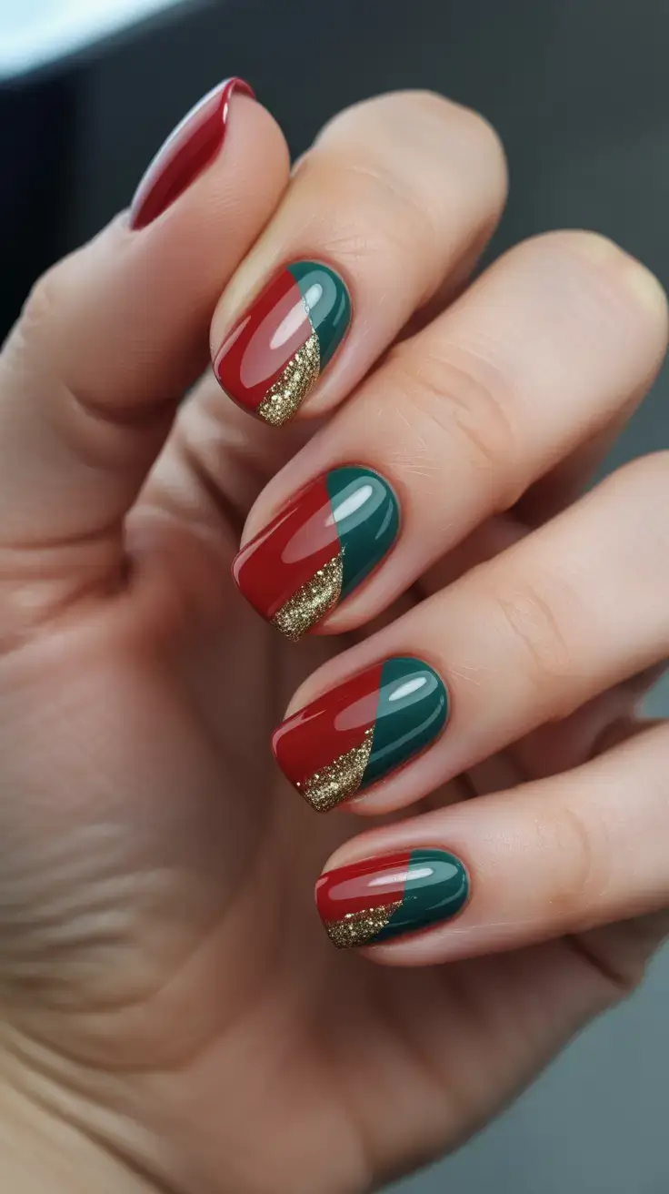 Prefer chic over cheeky? The cranberry red on deep Green diagonal split trimmed with a thin seam of Gold glitter screams classy. The size of this is shorter with oblong shape and therefore works well with red christmas nails on shorter days that are office friendly. The shape of the micro-glitter seam provides controlled Sparkly payoff and makes the appearance smooth – an adult version of red christmas nails glitter.