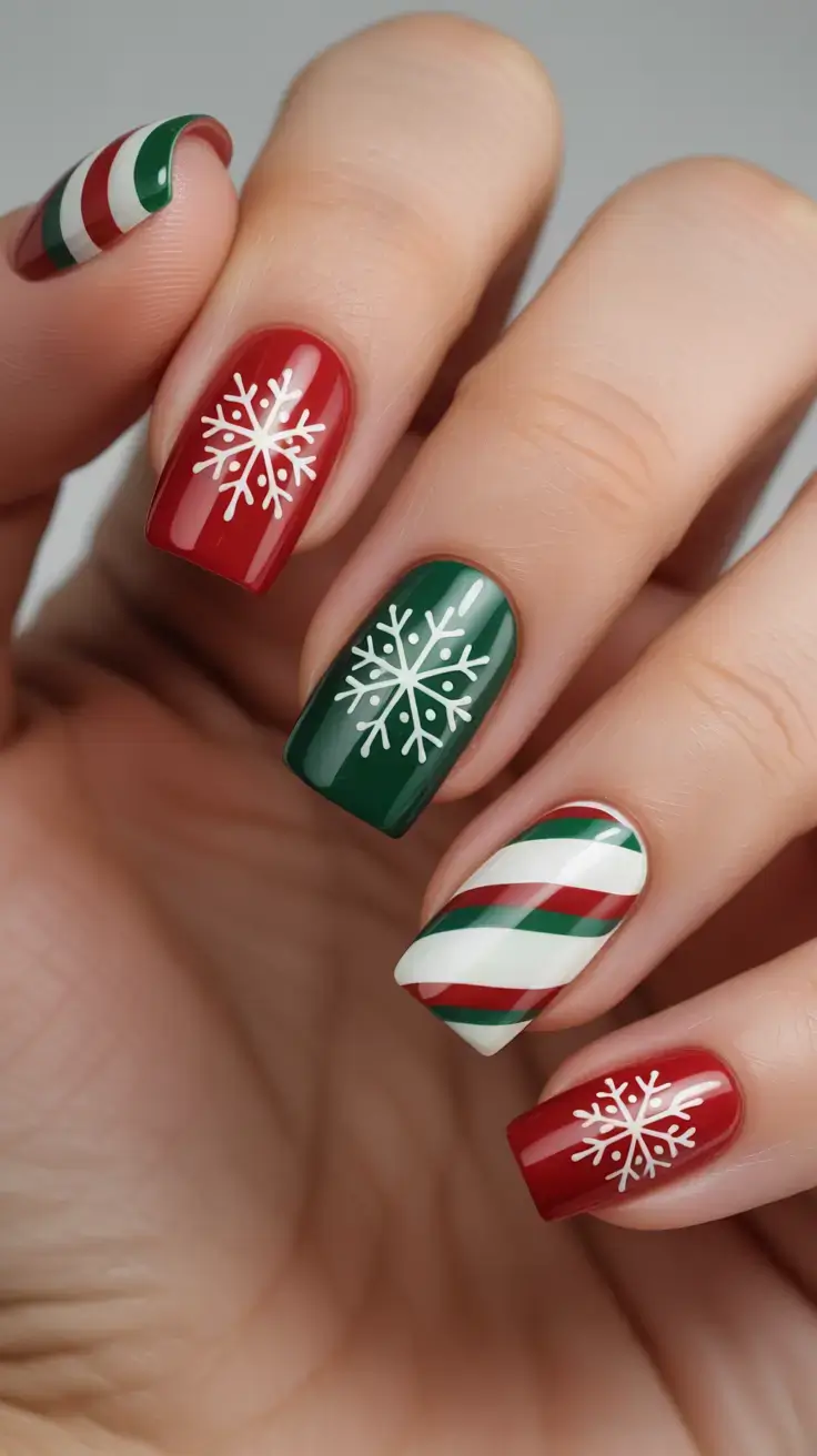 My rhythm: almond polish, two coats of red right away, then mask, then stripes straight on – I prefer three big and two narrow, so as to look even. Draw the snowflake with a fine liner and magnet the green should you be using a cat-eye to provide the dimensional Sparkly glow. Wipe the inhibition layer off and then apply the art – crispness counts – as most U.S. manicurists say.