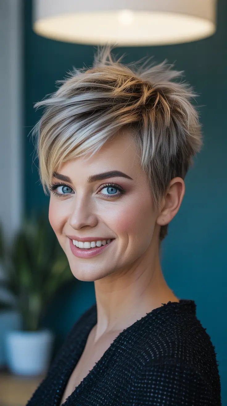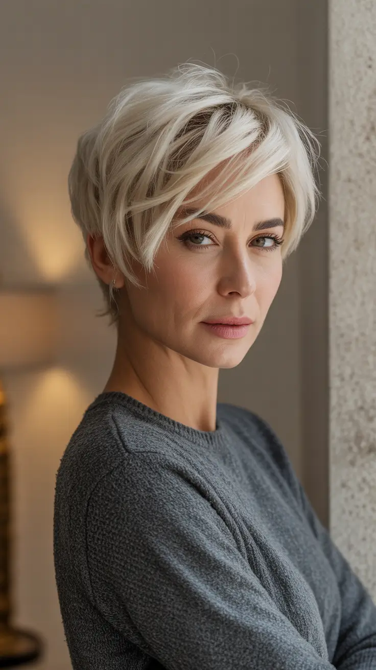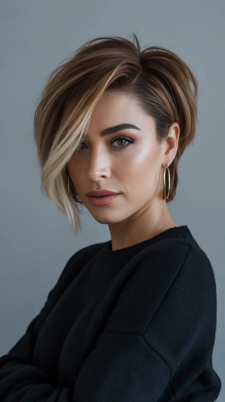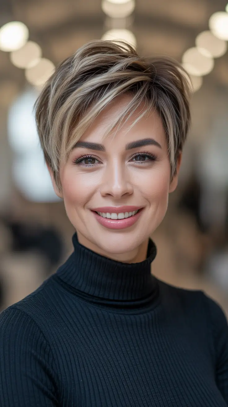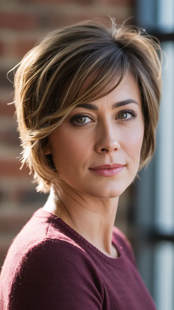 This pixie is sculpted short on the sides, fuller on top, and laced with thin “ribbon” highlights to brighten a winter complexion – and not scream summer. The feathered fringe floats across the forehead and can be swept aside for meetings or left forward for a softer mood. For winter, this is a confident pick for short haircuts. It is particularly suited for thin hair that needs a lift, and for straight hair that desire movement without the need to curl every morning.