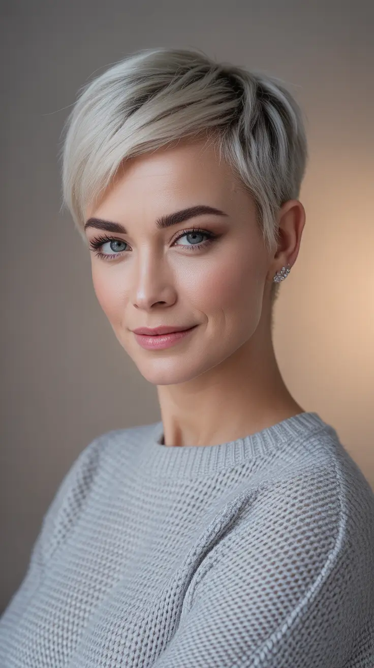 Like frost done correctly, a cool-platnum pixie captures its magic. Smooth on the sides and playful on top, the strands around the eyes from the side lose color drama and compete with brightness. Then, with a subtle glow and light reflecting from luminous white pixie layers, a chunky gray knit transforms along with the micro flows. Perfected to dose in straight hair and extremely gentle to thin hair that wants lift. For clean strands, effortless, and thick winter haircuts for women.
