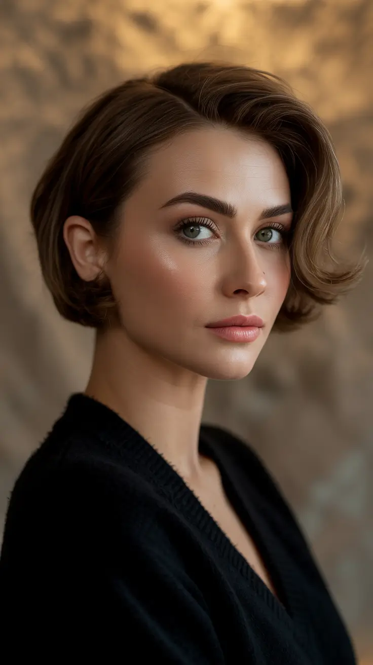 Nothing beats the side-part bob cut that’s clean and sits on the jawline. This one is all velvet shine – rich brunette with a beveled perimeter and one sculpted wave that frames the face. It’s complemented with a V-neck knit in black that polishes the look and allows the top half of the body’s silhouette shine through. It’s extra flattering on an oval face and is a wonderful favorite for short winter haircuts straight, a dream on straight hair.