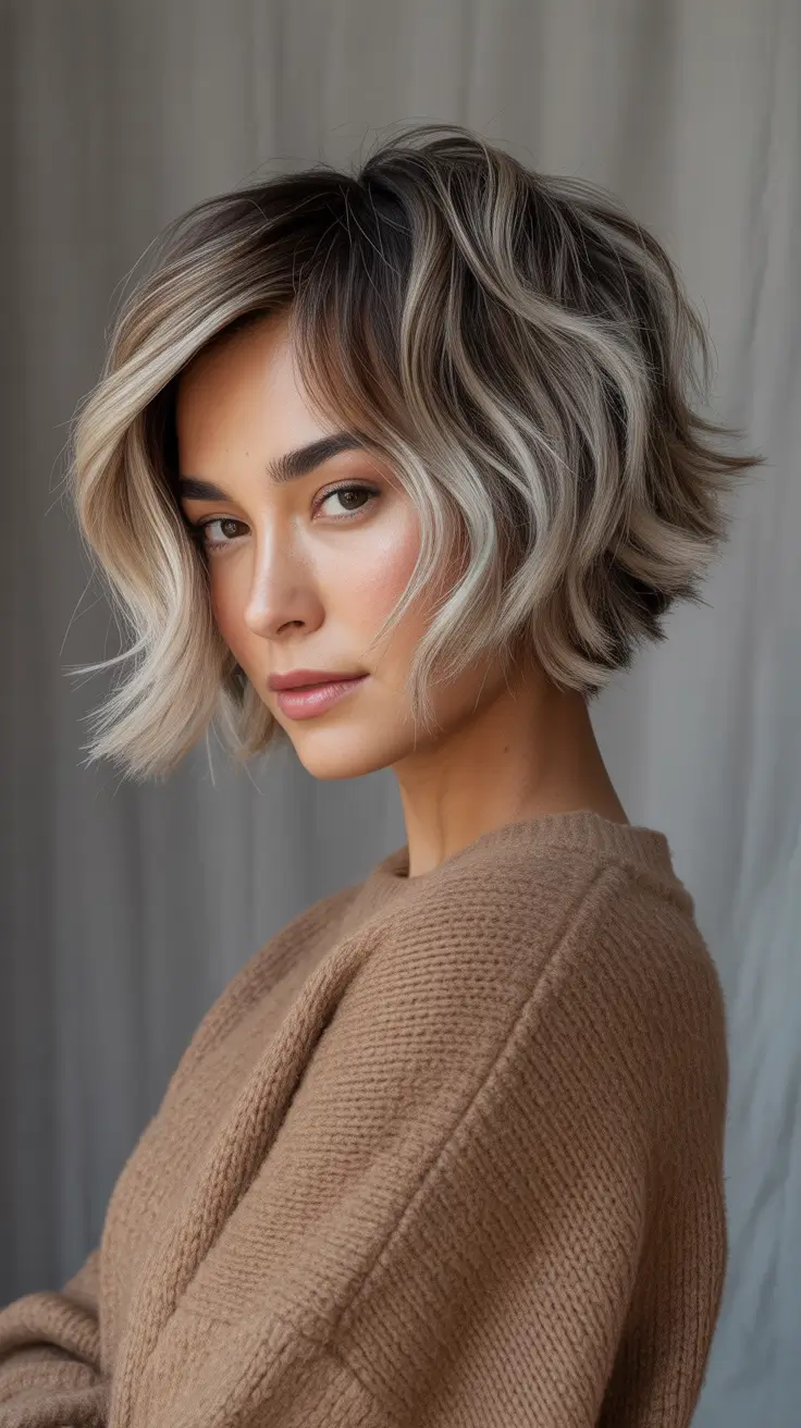 A cool boxy esque bob with a cool tousled bend and mushroom brown base, accented with bright face framing pieces. This is one of the short haircuts for winter and still looks soft and romantic. The broken wave pattern is very flattering for round and oval face shapes.