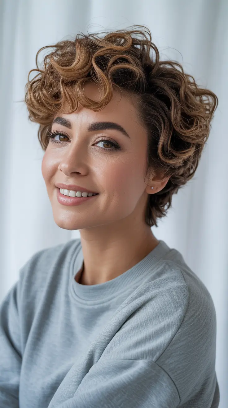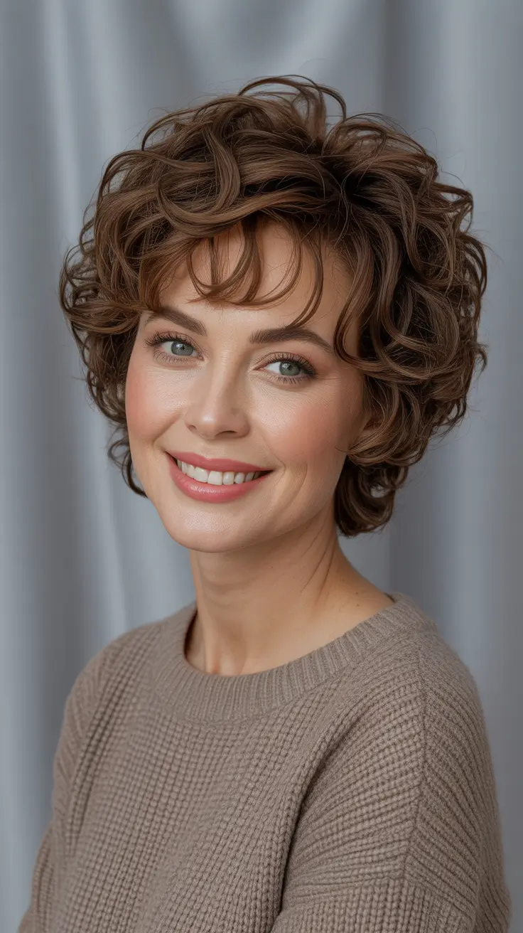 Happiness is defined spirals with shaggy outline and whispery micro-Bangs. That is why this style is among my favorite short curly haircuts in winter. Instead of growing horizontally, the shape builds vertically, preventing the curls from exploding under the beanies. A win for the different densities of Curly hair, especially for Medium and Thick hair.