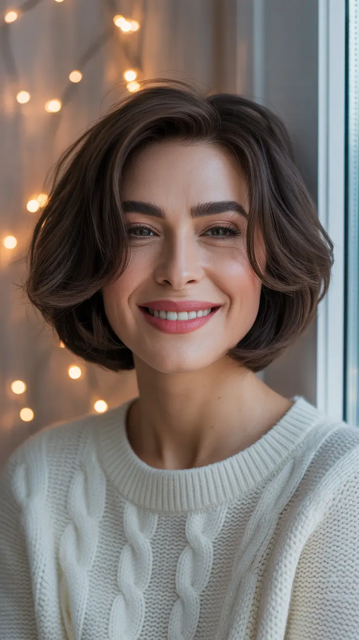 This is a classic French bob hovering at the jaw with rounded, airy volume and tucked-under edges. It’s softly beveled, not stiff, which keeps it playful. On Wavy hair or straight hair the length hits that sweet spot where it frames the cheeks, but still swings – basically the blueprint for short winter haircuts for women who want polish without maintenance.