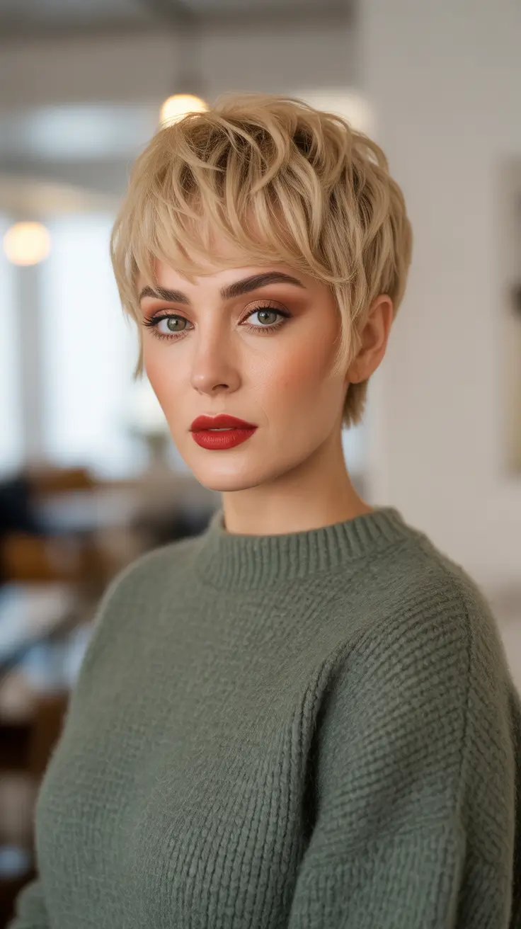 I admire the way this pixie has so much goodness left on the top and at the same time so tidy around the neck and ears. The crown is light-weight, airy, and chopped into small pieces, and the fringe is rather mutilated, almost like miniature bangs of the curtain, falling over the forehead most delightfully. The thin depth and creamy blonde at the roots make it appear not flat and therefore it appears in a sense of one of those short hair cuts that bangs with and yet feels grown up and sophisticated. The type of cut suits perfectly on an or any other person who desires a fresh, open frame around the eyes and still retains all the length all in one dramatic chop.