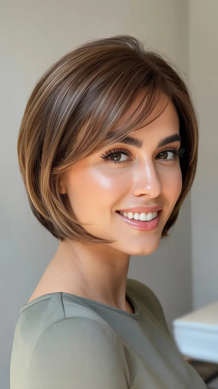 This bob is so good depicting how soft structure can uplift the face fully. The length slides under the jaw and folds into itself slightly hence forming that smooth elegant shape without being rigid. The edge fringe cuts across the forehead in a mild curve and merges directly into the rest of the cut, so it lies between layers and full fringe – ideal when you are flirting, but not ready, and nothing blunt. Its smoothness and slight accents give it a polished look, making it one of the amount of smooth hair short cuts, which can be comfortable enough to be worn in the work week.