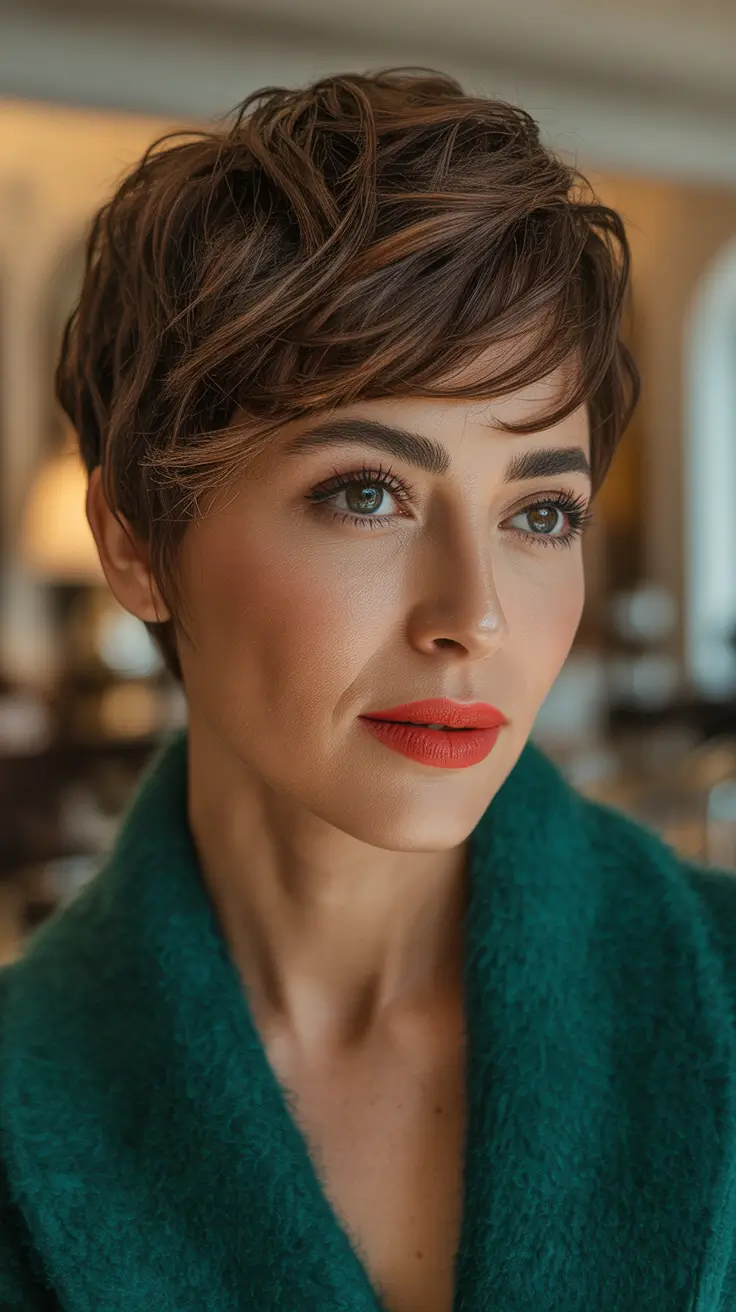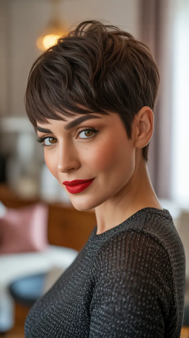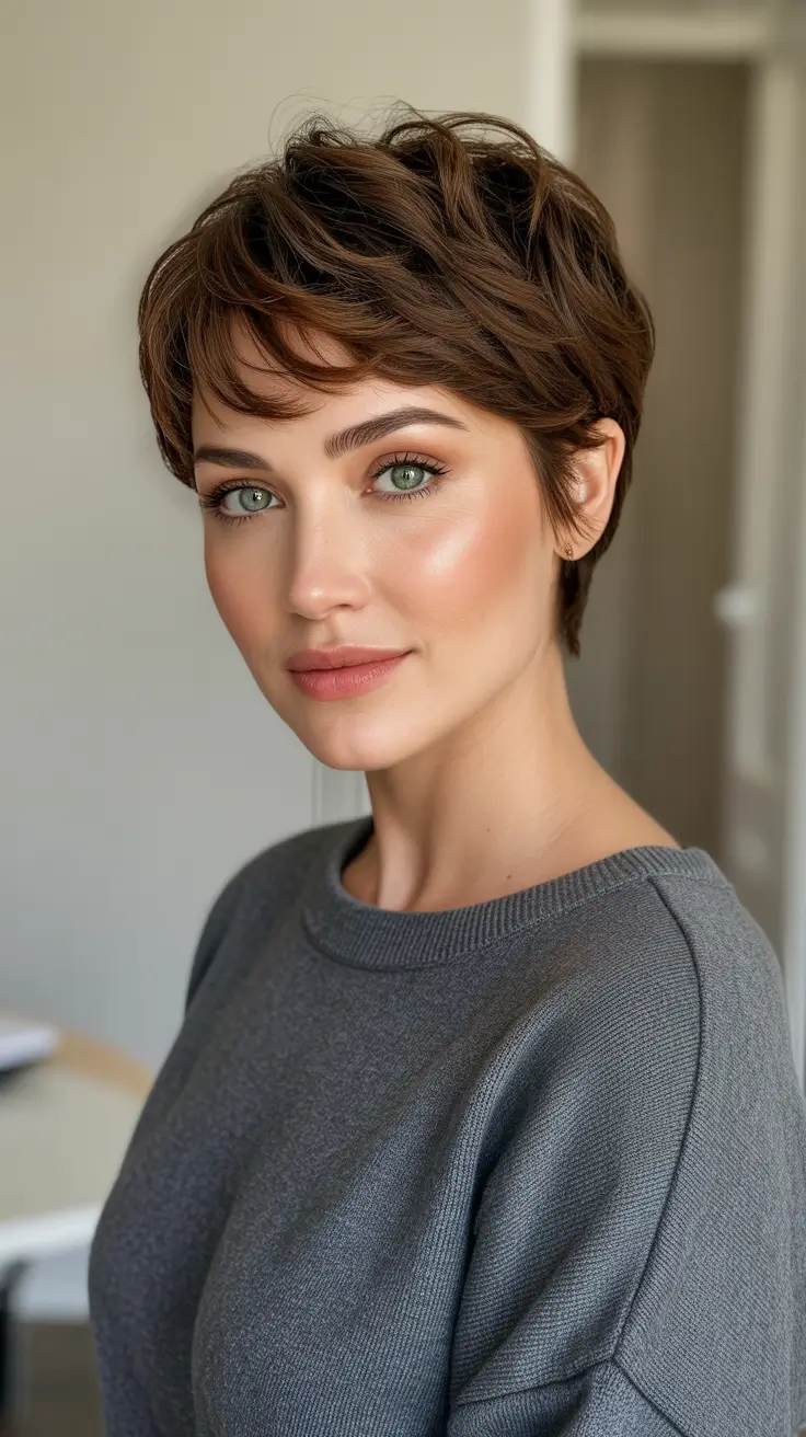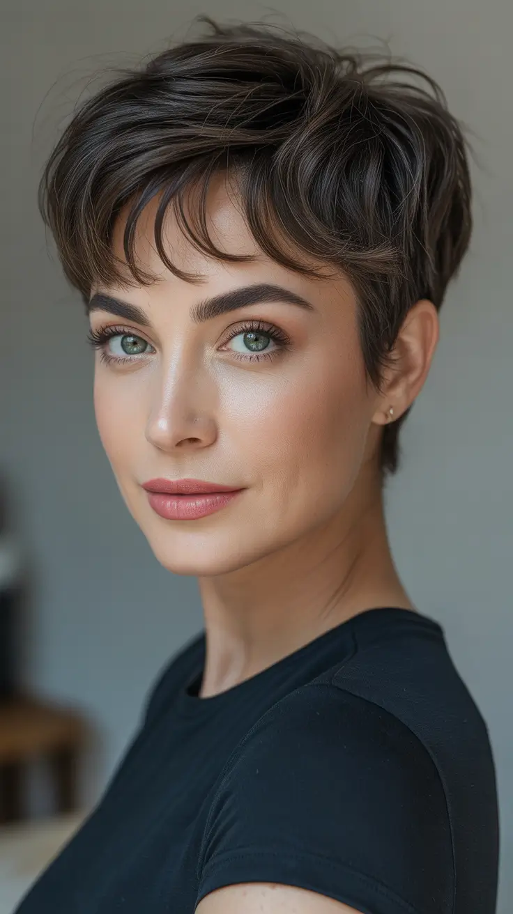 In this case, the hair has been cut into a smoky brunette pixie with ample texture at the top and a fine micro fringe. I also prefer the high position of the fringe as it only begins to skim the forehead, making it a sweet position to have some bangs in the haircut without the need to feel heavy. The tapering is done neatly and gives that clean silhouette that serves so well in 2026 and the top remains piecey and tousled. When applied to medium density hair, it becomes a rather easy alternative among short hair styles in those women who need to be cool but at the same time wear it daily.