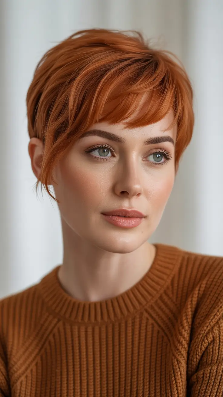 In a way, emotionally, it is one of those cuts that is soothing like a mini-re-set in the fall or in the early spring when you want your hair to capture that mood of a change of season. It is cute, undeniably, but not childish, and can be adorned with natural makeup and a knit in warm colors to create the impression of a very cozy home. In case you have a collection of a hundred copper screen shots, and you have not tried it yet, this pixie may be the nudge you are looking to.