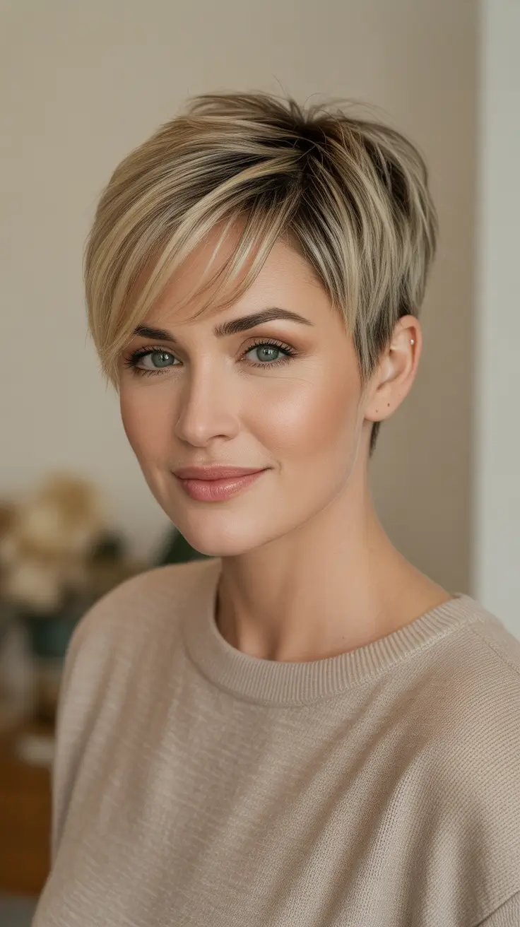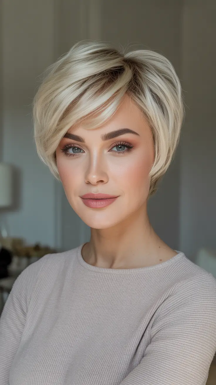This type of gently stacked blonde pixie is my favorite conception when a person wants to have a cut that does not need hair salon work but at the same time wants to be feminine. The crown is of an airy texture, the sides of it are clean, and the long side-swept fringe nearly disobeys like Bangs but does not seem heavy. It is fortunately positioned on straight hair, or a little wavy hair and thus one of the least complicated short hair cuts on straight hair and also a secret tool on flat fine hair since all the layers provide the soft lift at the root. Coupled with a basic knit or a V-neck top, it immediately translates to the cool-formal – very weekend brunch-after work drinks – energy, a combination of which I adore.