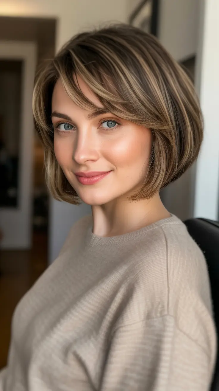 It is a classic bronde bob which is the haircut I suggest when one says they just want to look presentable every day of their life. The end is folded under the chin, the ends are neatly rounded in and the fringe at the sides of the face is soft without being full Bangs. The warm highlights running through the darker foundation bring it a dimension which works very well on straight hair making it one of the simplest blunt cuts of hair on women who prefer low drama haircuts. It is the kind of energy this gives the impression of I woke up organized with a simple neutral sweater.