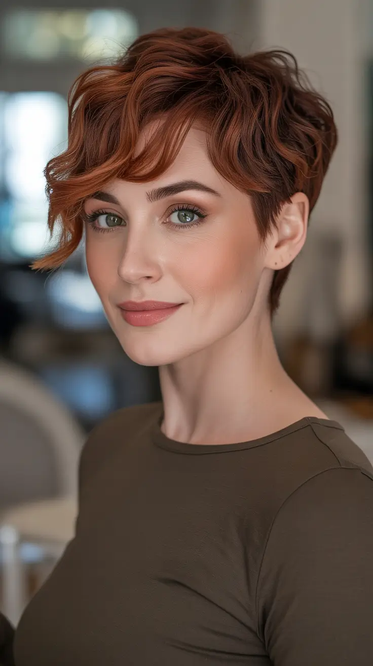 With its coppery playfulness, Its flirtatiousness. The top is a notch longer with loose curls and soft to touch so that with all those little wavy strands, it is quite Curly and Wavy hair feel, even though your natural top may be just a bit wavy. The front is almost side swept, almost imitating side Bangs, and the sides and the back remain neat and trim. It is a good short women haircut between a cute and a cool cut and the warm copper color gives the skin an extra glow.