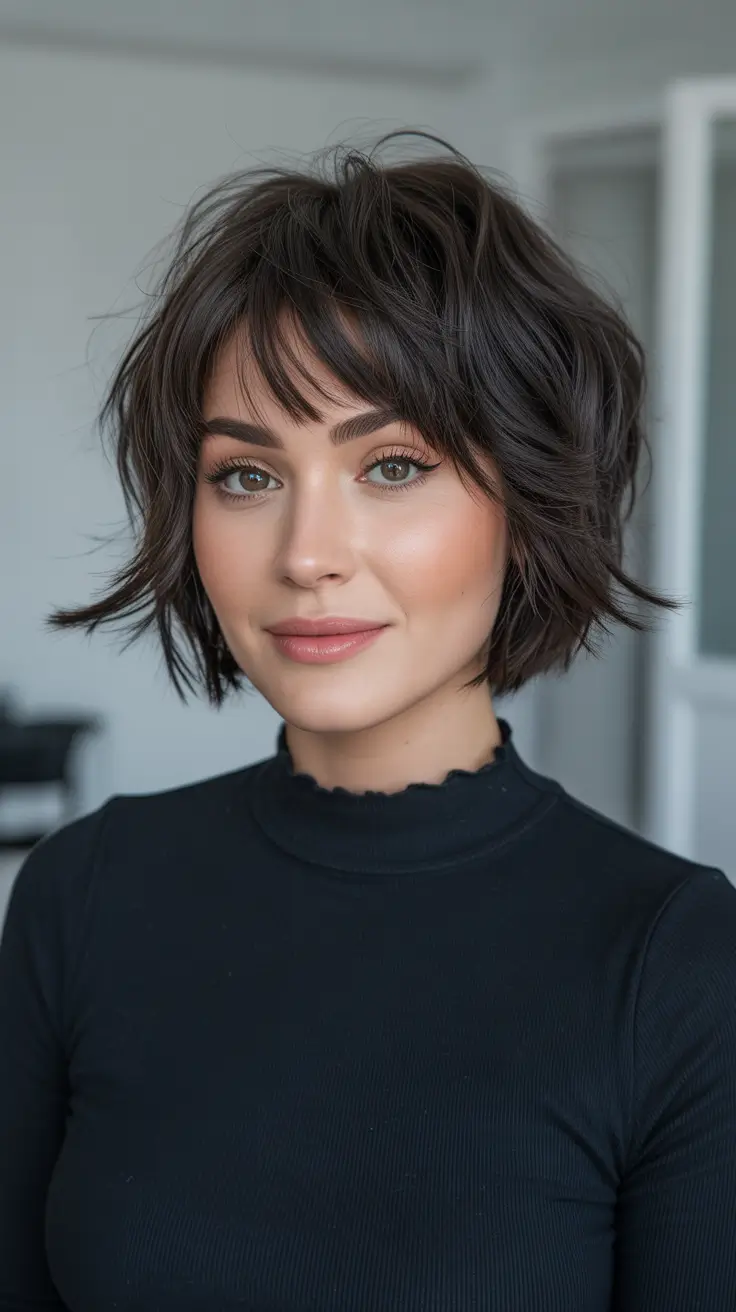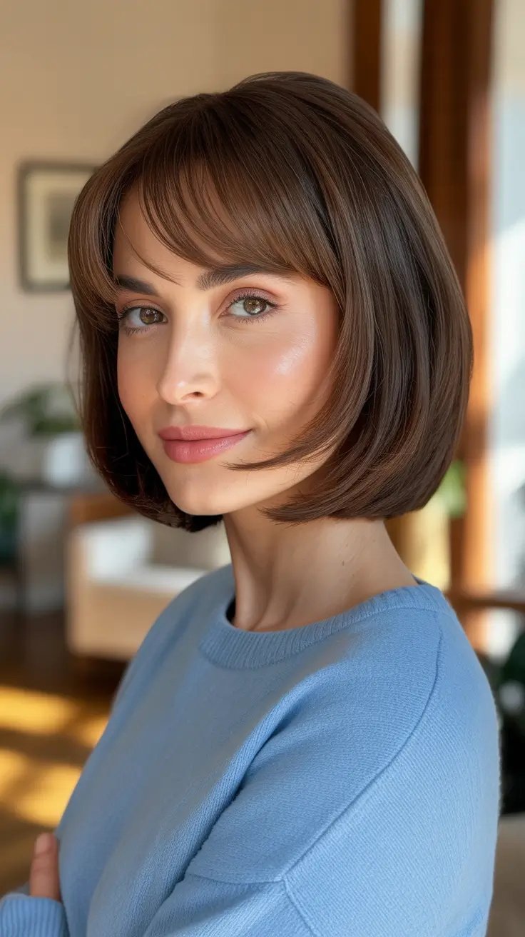 This square-ish brunette bob is so old-fashioned almost French. The length is placed appropriately at the jaw curling in gently with the front presenting light and wispy Bangs that do not interfere with the sides. Since the fullness is positioned around the lower half of the face it becomes a nice alternative as you seek short cuts on round faces and at the same time make it feel pleasant and feminine. The overall appearance with the pastel sweater has such comforting friendly vibe – to me, it reads like a bookshop on a Sunday.