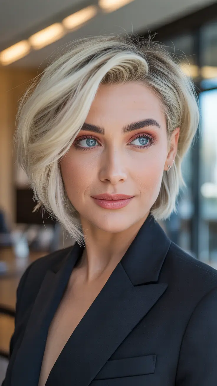 This is such a declaration of 2026 lob of power. It is the depth that skims on the shoulders, and the deep part, throws the first part round at the back of the face in order to project a swept effect. On Straight hair or lightly Wavy hair, it forms a gorgeous curtain which, nevertheless, is a short cut and provides certain drama. Neutral blazer, as well as the clean lines make it one of my favorite short haircuts to women who want office-ready hair and at the same time the hair to wear that still feels fashionable.