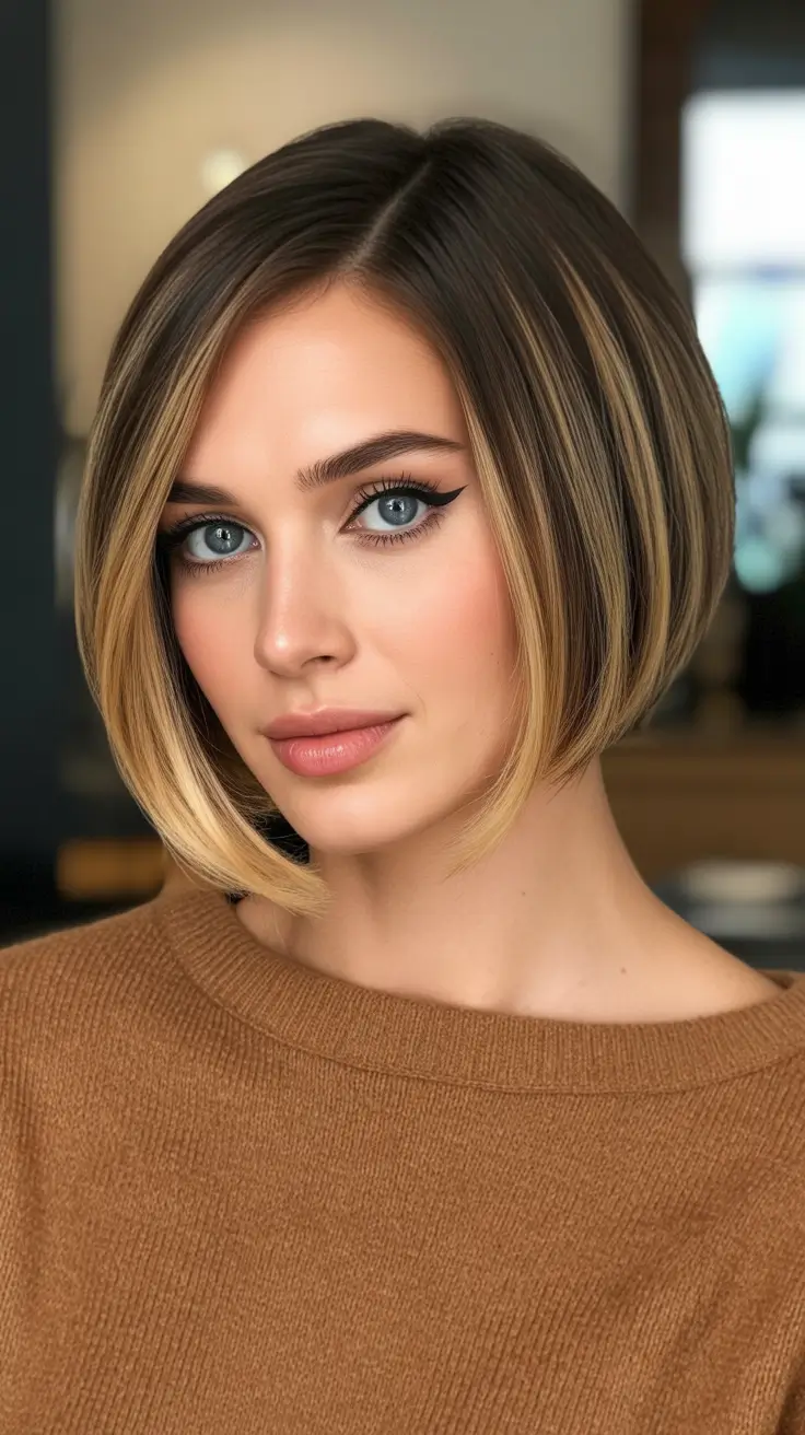 There is nothing too serious about this bob; it is a clean and low-contouring around the face. The length is perched just at the jaw with the front a little bit longer and slightly curled inwards and thus fits around the cheekbones in a most flattering manner. There is lots of talking done on the color here blonde panels softly all the way to the front, and the base is slightly darker making the lighter pieces stand out. It is a polished solution to all those searches of short hair cuts in straight hair, and it is particularly nice to those who have in their possession Fine flat hair and want to make it appear thicker but do not want to go all the way with layers. It possesses the silent luxury vibe all 2026 mood boards seem to have at this time.