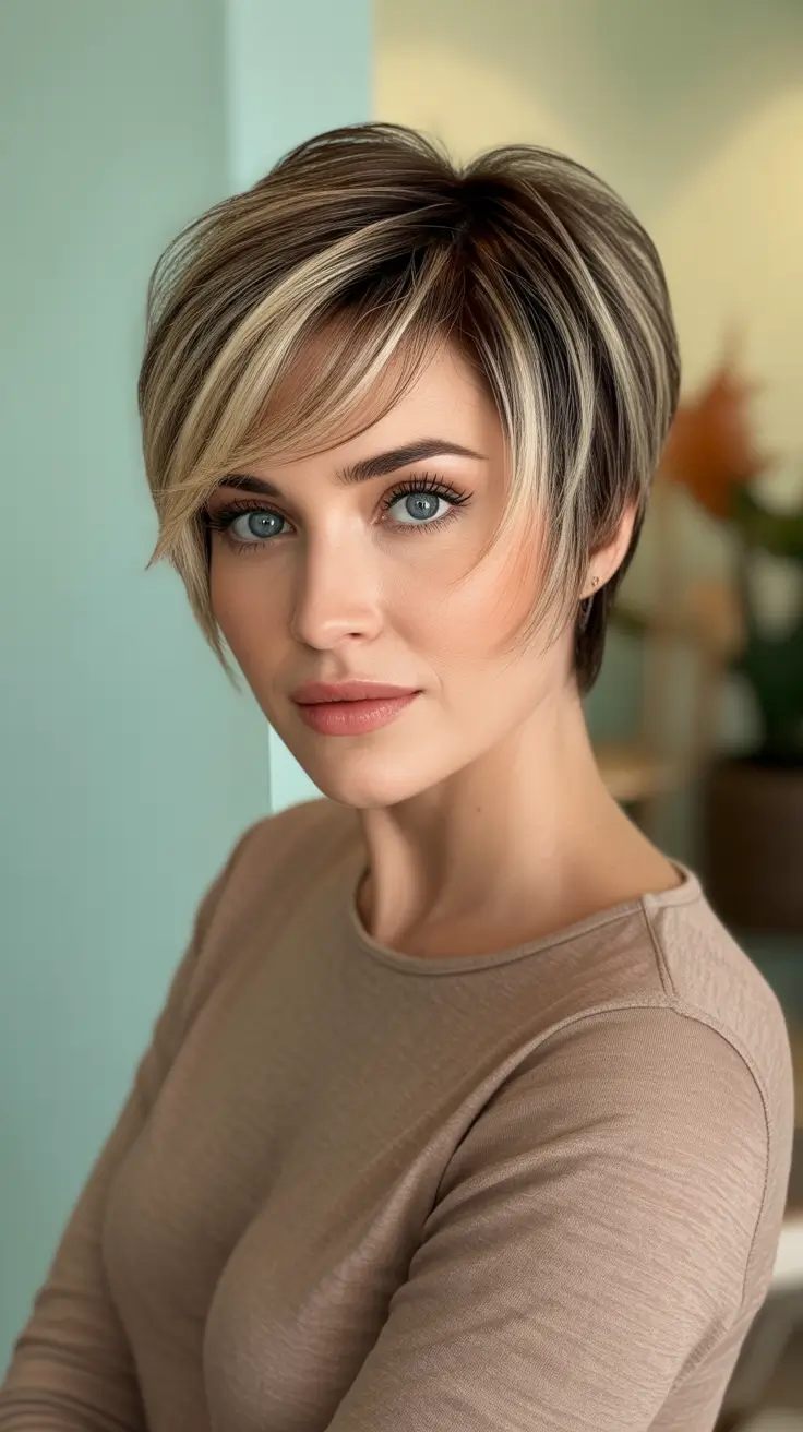 The style is on the brink of a pixie and a bob, hence the style is so flattering to many individuals. The adult one also has the back slightly shorter, just lifting the nape, to make a small stack, and then the front and sides rubbing the jaw in rounded curves. The side fringe sweeps across the forehead blurring the boundary between bangs and layers, therefore it is dotted diagonally without the feeling of weight. The combination of cool and warm invite with the top is both bright and deep, and is a beautiful option in case you are gathering inspirations of short haircuts on women that will not make you feel too serious.