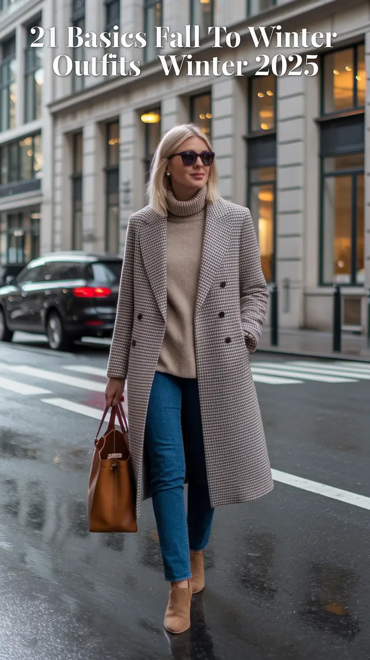This look is unapologetically powerful. It’s tailored, bold, and made to be seen. The camel coat that is long gives a neat outer frame but the highlight here is the grey blazer that is cut sharply and worn as a top. With houndstooth trousers and pointed white boots, this is contemporary suiting with night out possibilities-this is a new york fall outfit that can go both ways, day and night.