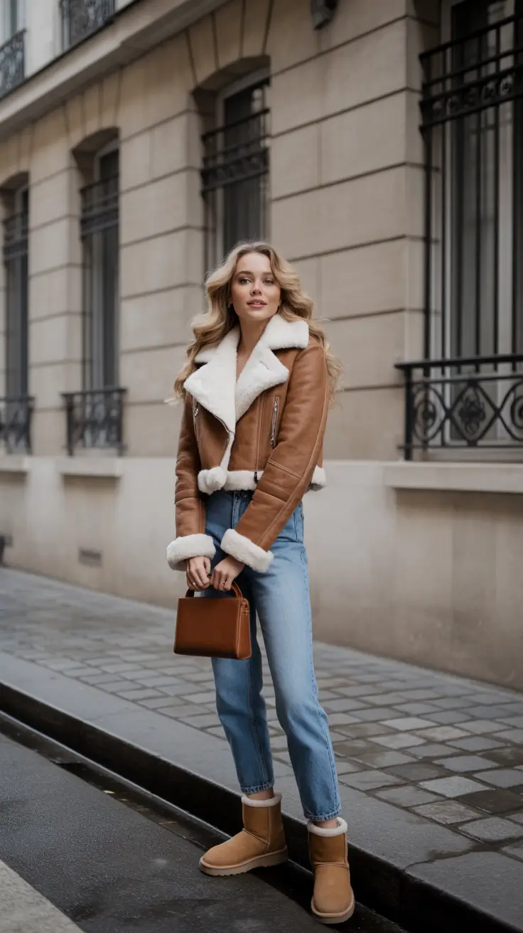When the sun hits a cold sidewalk, I pull a tan shearling aviator over a camel turtleneck and pale wide-leg jeans. The shearling collar is the high-contrast hero my face needs, and already I have that après-ski feeling—even if the actual mission is picking up flowers and taking a scenic route home. Chunky black-sole boots keep it urban, so the outfit says “city stroll” and not “woodsy hideaway.” Winter outfits 2025 lovelies, this is the fresh new piece you’ll want, able to keep cozy into 2026.