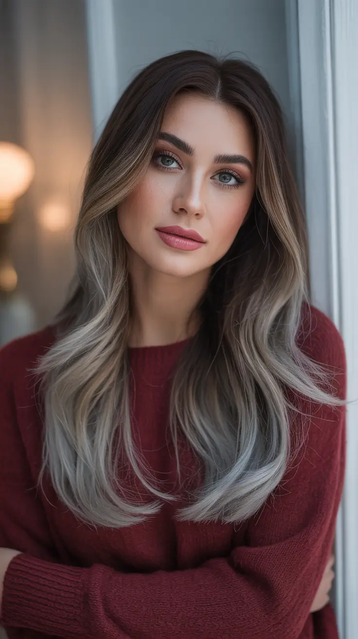 I am in love with this smoky version of brunette – a cool mushroom base that is melting into frosty ashy ends that spell refined snowfall on long layers. The shift is low and ultra-soft, thus, it is grown-up instead of high-contrast. This type of gradient nails winter hair color balayage ombre, in particular, on me, when I desire that subtle transition of Dark roots to airy, Blond-kisses tips. Combined with a rich burgundy knit, the entire ensemble is fireplace-ready, but office-presentable.