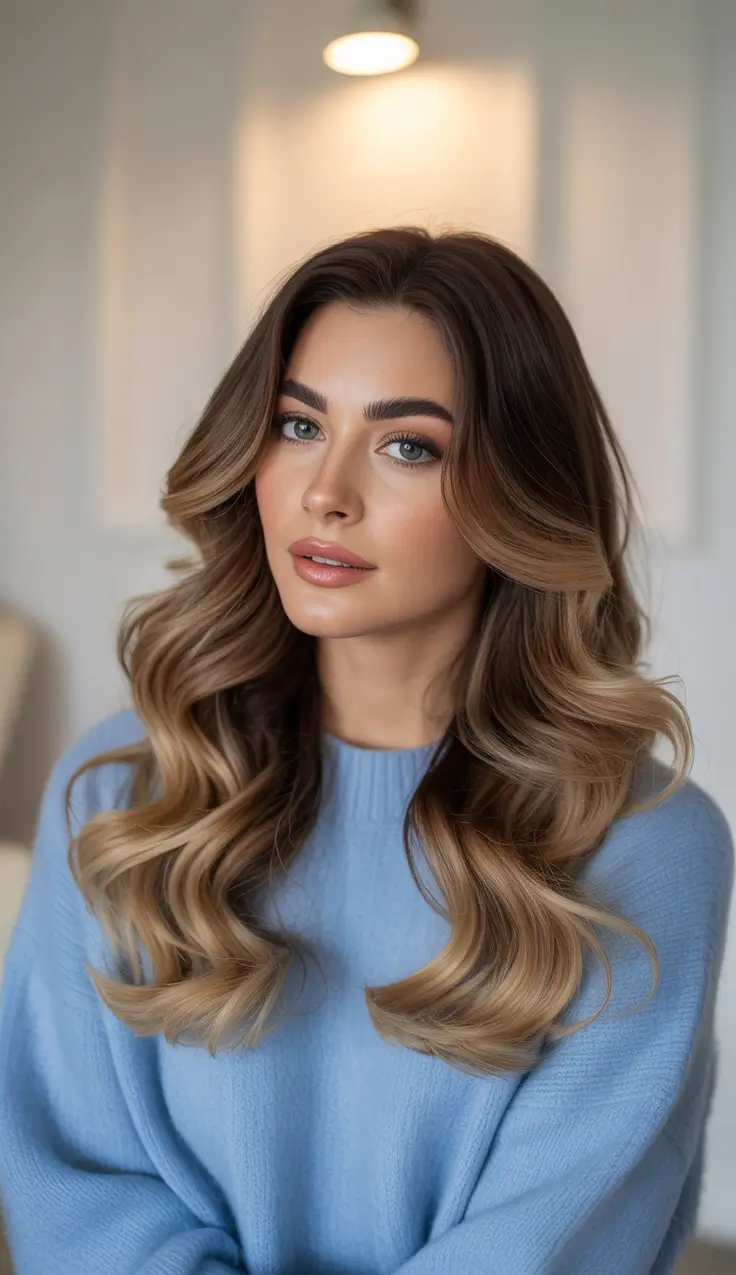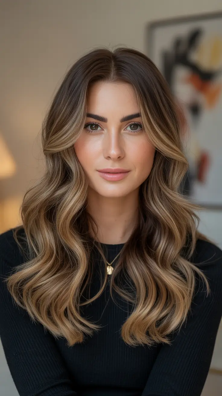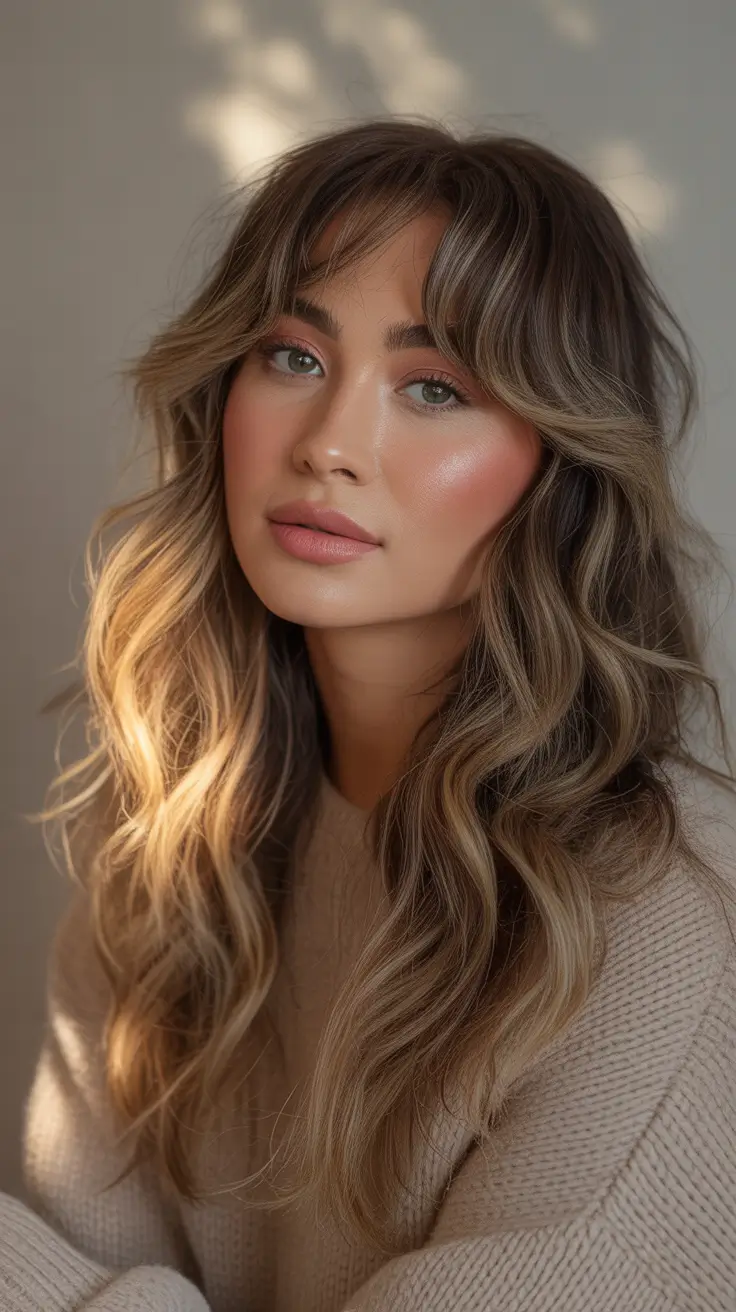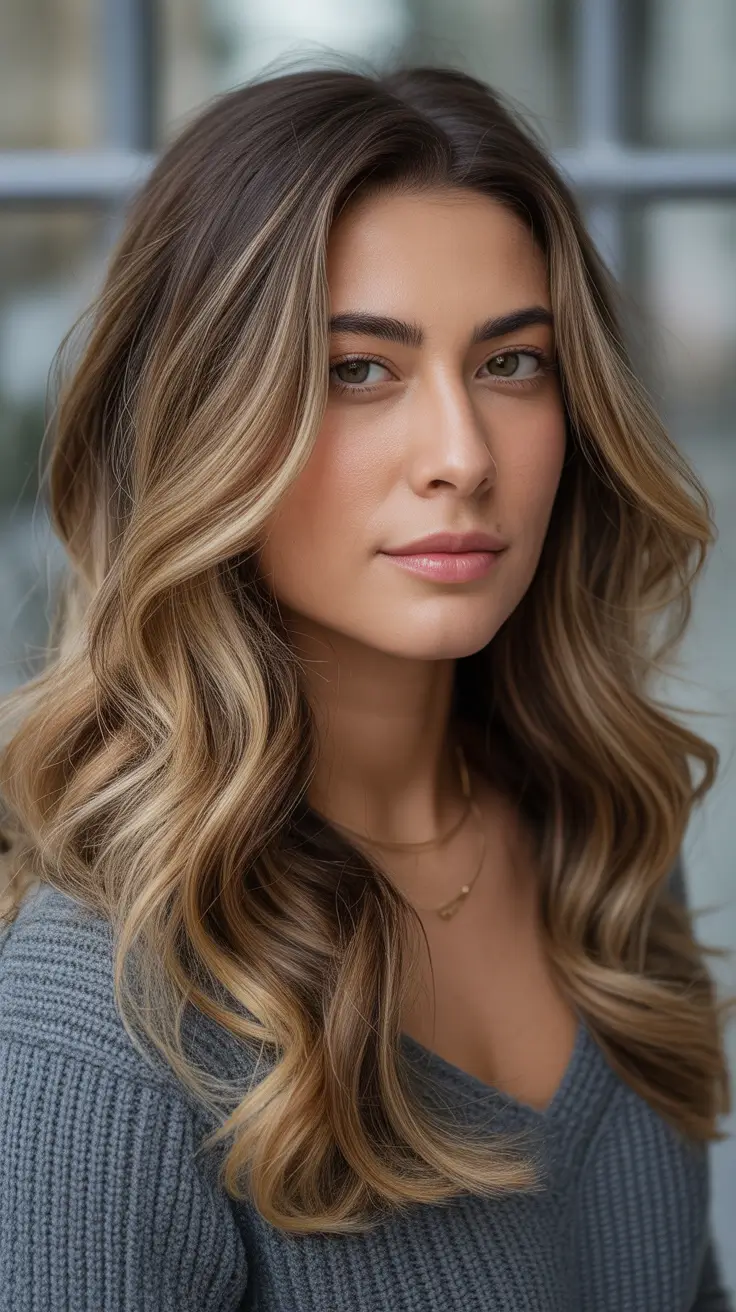 The foundation here is chestnut and the hand-painted ribbons inclining to golden-oat, touch the face and sweep brighter at the ends. Long sleeves give that floaty, shiny effect that is light with a ribbed slate sweater and a small gold chain. It is a fancy street of balayage brunette lovers who need coziness but can still pass as winter-time.
