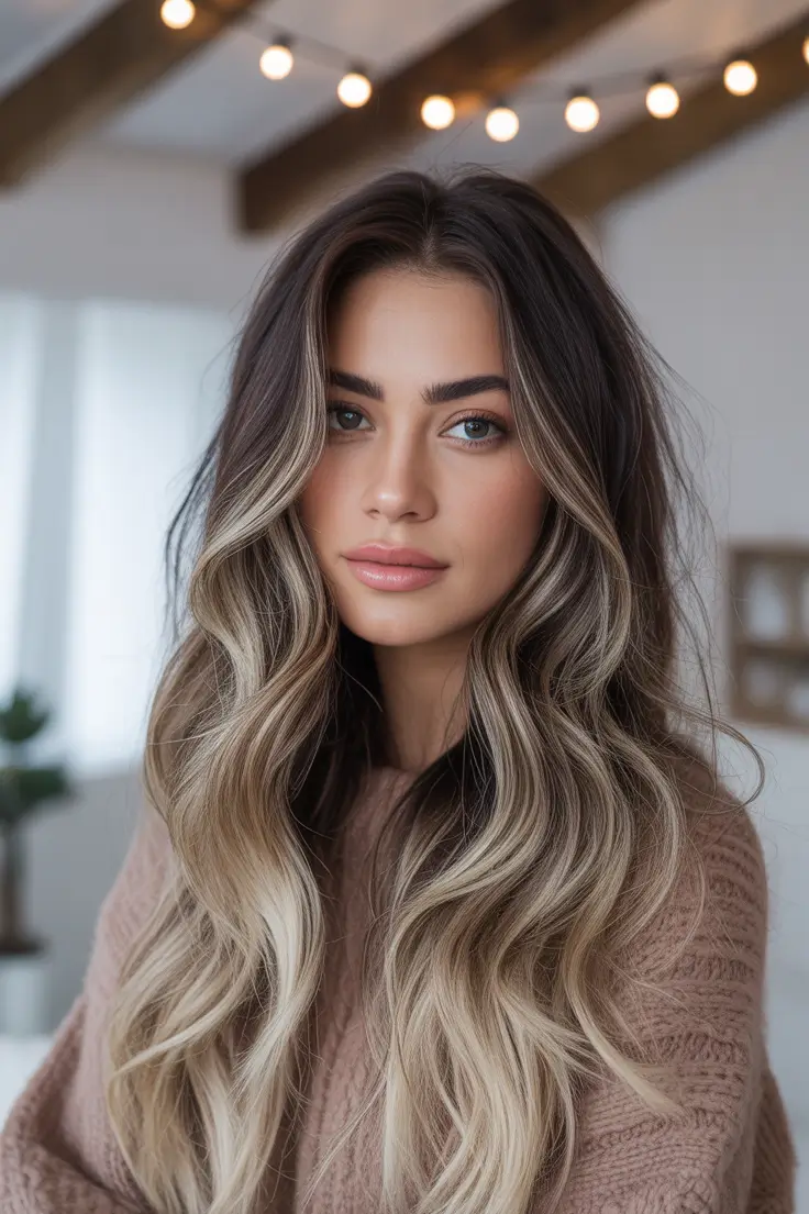 Hello to drama done right, a rich brunette foundation swept in cool candelight blonde to the mids and ends. It is placed strategically: brighter panels are sweeping under and around the face, leaving the crown dark to provide the dimension. It has a snug taupe knit that fits that balayage ombre winter hair color feel without being too hard on the edges.