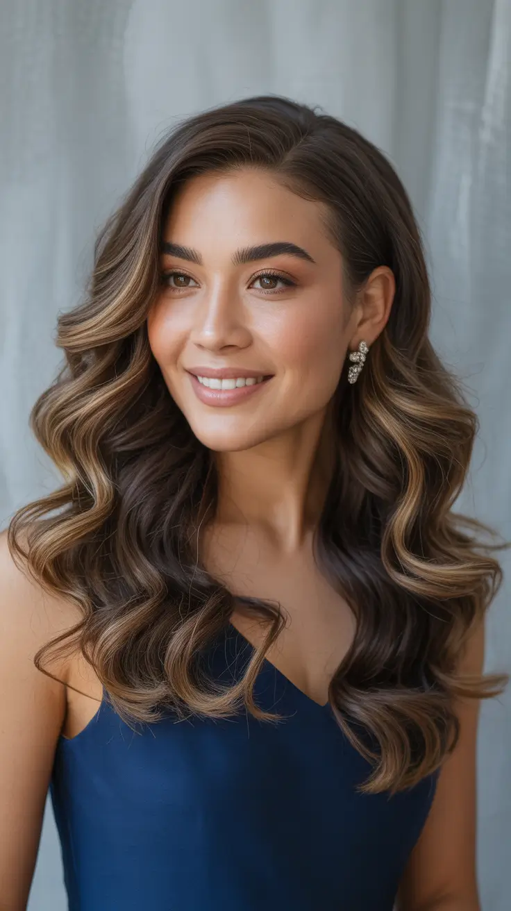 For these the molten, brushed-out waves that skim the shoulders and curve away from the face, I’ve loosened a bend, and they’re the quintessential winter formal hairstyles for long hair and a softer option for winter formal hairstyles curly hair. A clean side part and one minimal jeweled clip gives “I tried but not too hard” energy.
