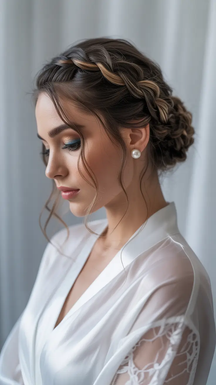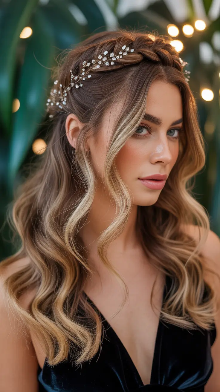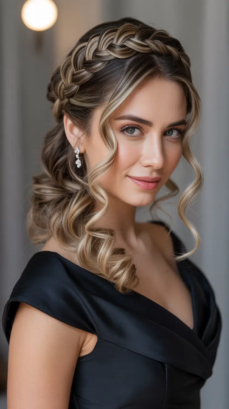A polished crown braid traveling around the hairline meets cascading curls that are gathered low – a romantic combination that lives happily in winter formal hairstyles for braids as well as winter formal hairstyles for medium and longer hair. The face-framing pieces are gently curled to keep the shape soft instead of harsh, which looks lovely with off-the-shoulder dresses.