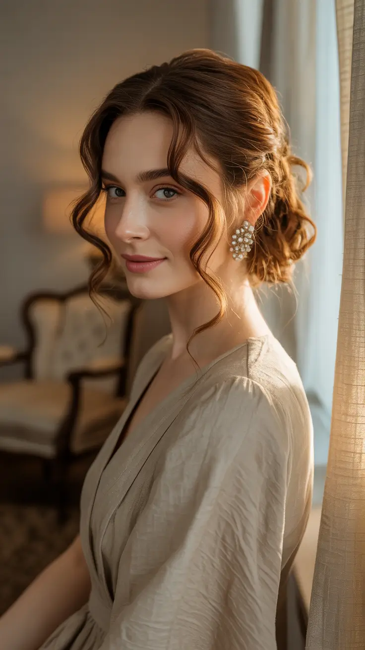 This low, tousled bun with airy temple tendrils is the definition of relaxed elegance. The curl direction floats away from the face and the bun sits at the base of the head, making it perfect for dramatic earrings and wrap coats.