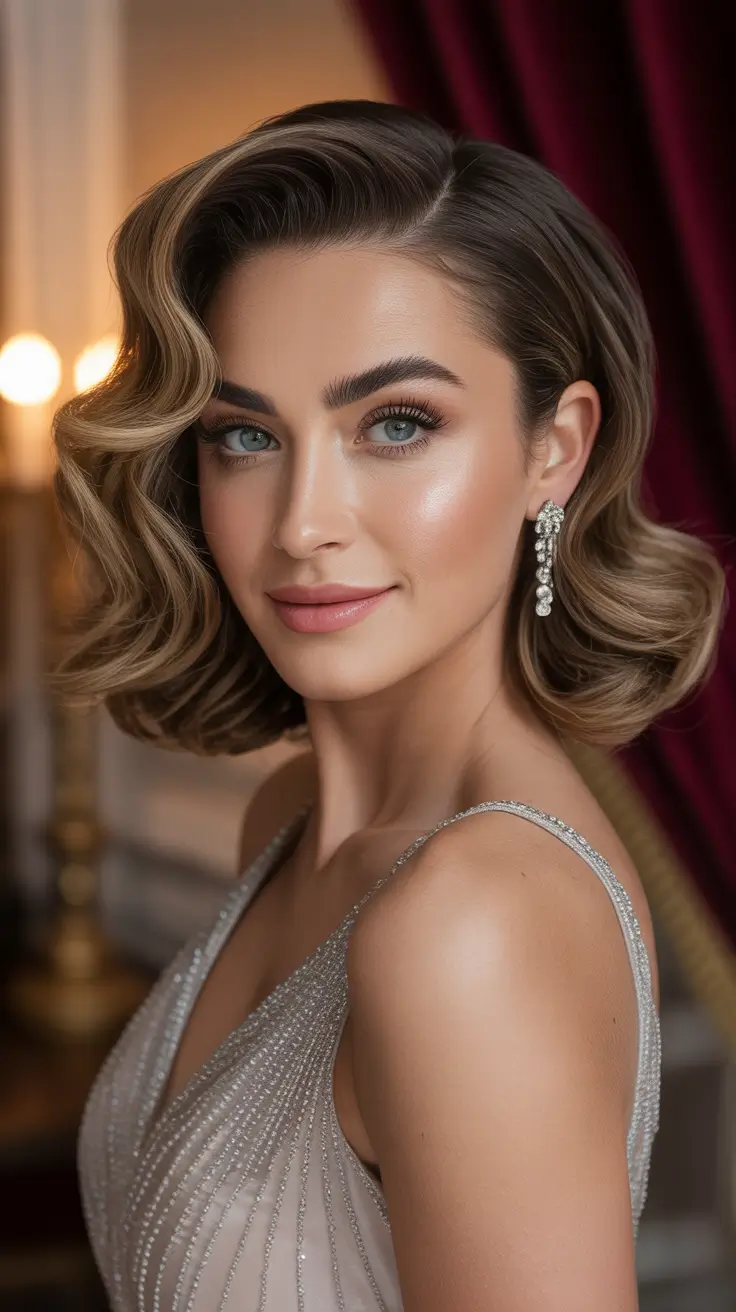 Soft and sculpted S waves draped elegantly over one shoulder and combined with a stylish side part is timeless and luxurious and benefits from a touch of shine. I much prefer this sassy and dramatic winter formal hairdo since the hair fanned out over one side of the head slips effortlessly under the coat collar. The waves are neither curls or bends so the hair is particularly flattering to the jawline and neck by extending the neck. Total sophistication without being too over the top.