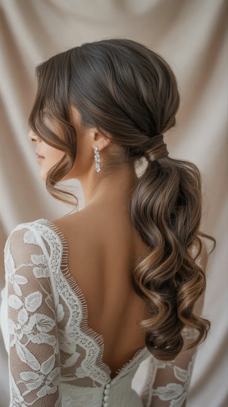 I’m a devotee of the low pony when I want sleek polish that doesn’t compete with a high neckline on the dress. In this style, the volume is placed at the crown and temples, the pony is wrapped with its own hair, and the lengths are curled in large barrels for movement. This is the quiet alternative to an upstyle and works beautifully for winter formal hairstyles for medium and long hair.