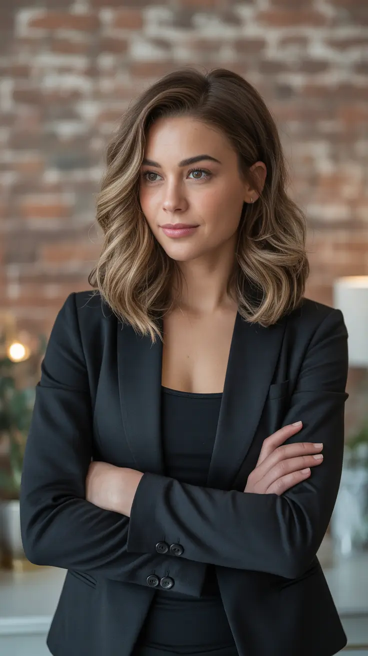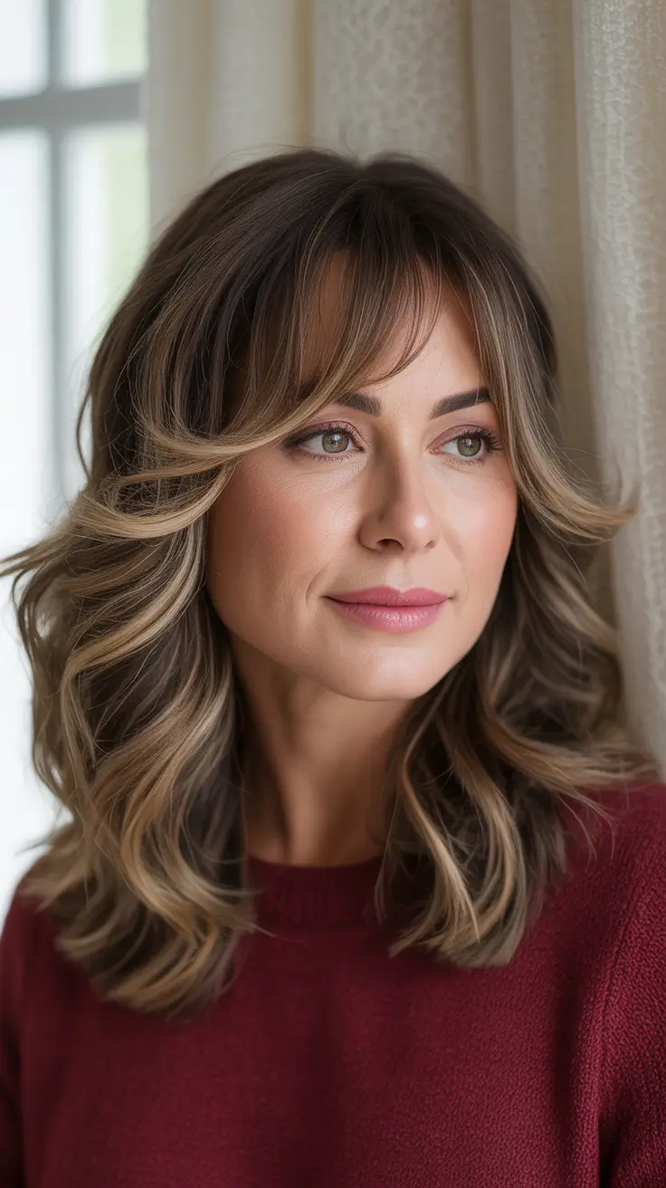 This medium cut right at shoulder length has a center part & diffused layers with bronde ribbons that brighten the face. The Wavy hairstyle looks so luxe with a camel cardigan & white tee. The payment piece is soft instead of extreme, so it strikes the medium wavy & complete wearability sweet. Ideal for glow seekers in need of a major light winter volumizer – perfect for 2025 winter.