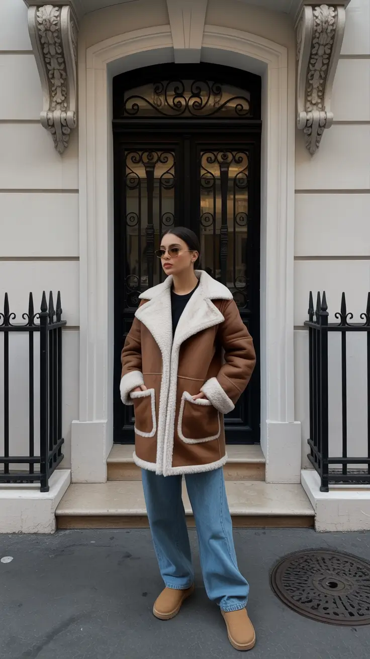 If you are creating this from your closet, choose relaxed or Wide leg jeans with a clean hem, a shearling or faux shearling jacket that hits mid hip and the UGG Classic ultra mini or Tasman style to keep the ankle slim. A tonal knit beanie finishes it so you look styled, not just bundled. The denim’s light wash makes everything airy against the heavyweight jacket, which is a big deal on gray days.