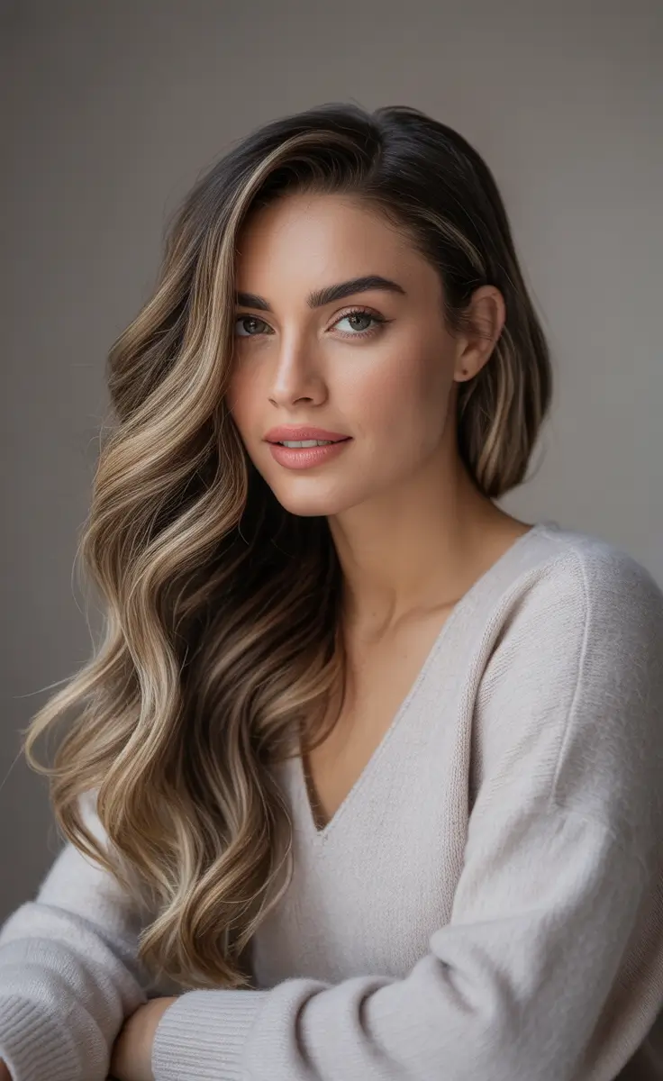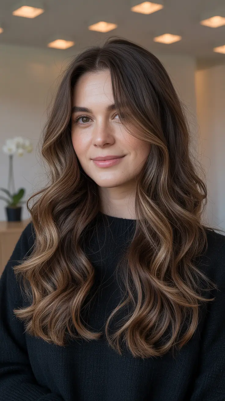 I prefer a mocha base that effortlessly transforms to biscuity ends for when I want low-maintainance luxury—the ideal brunette-to-blond seamless blend. Layers are elongated with soft buttery, face-framing contouring, while the finish is a sumptuous wave that complements a latte-toned sweater. It’s understated but totally on-trend, especially for those searching for winter hair colors for brunette with highlights around the cheekbones. Chic yet effortless.