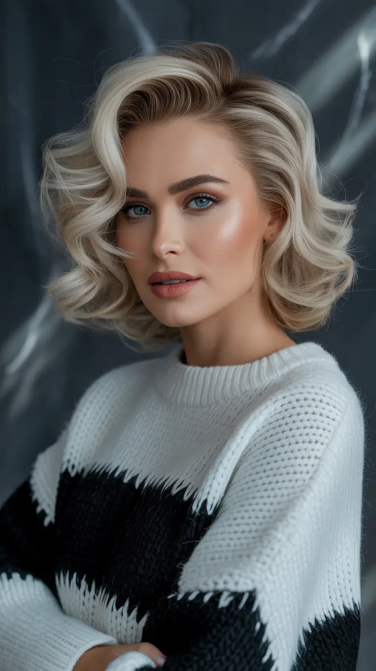 Winter glamour with zero effort, this style features short sculpted waves, and a pale icy vanilla blonde that captures every snowflake of light. The bob. Cut, a touch below the jaw with soft rounded edges for movement, is slightly deeper at the roots for a soft grow out. Worn with a chunky black and white sweater, confidence is effortless. For those who follow K-pop beauty trends, you will recognize the vibe of this look. Very cool, very bright and on trend for the season. This style is the essence of winter hair color trend.