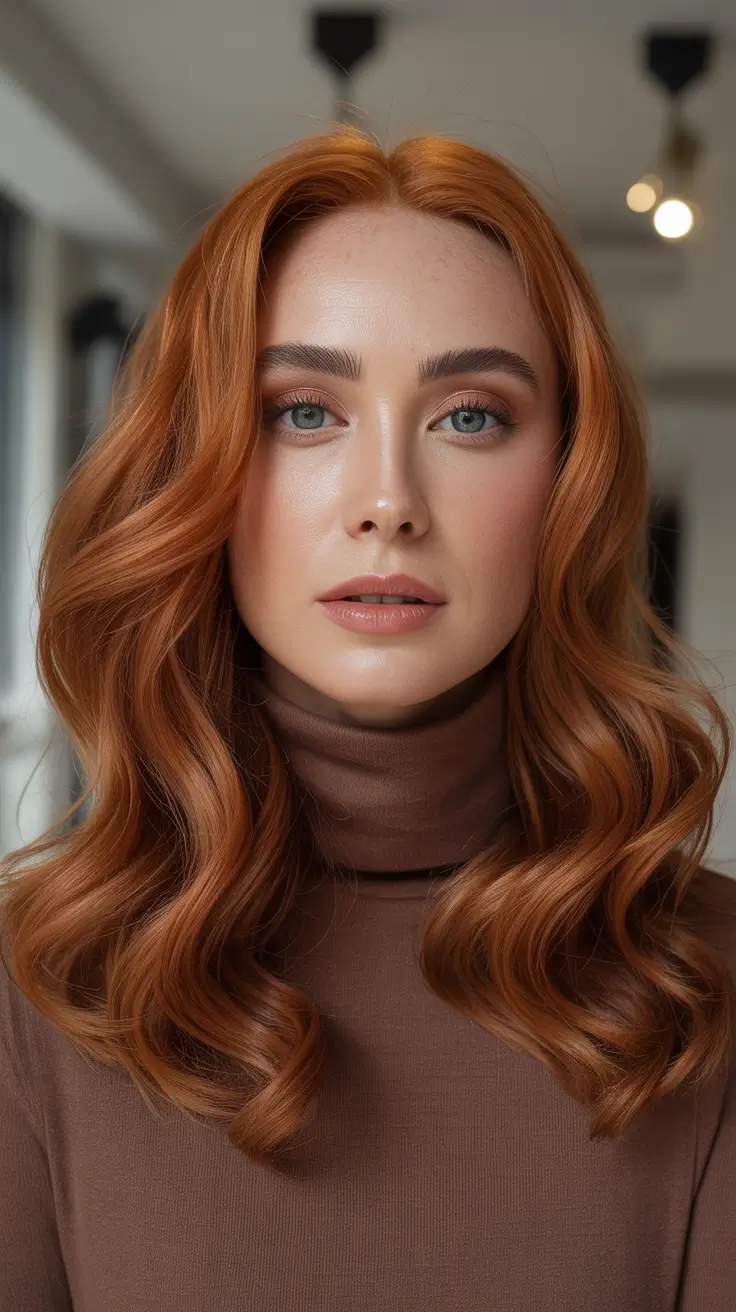 This copper holds a wonderful balance between cinnamon and apricot, shimmering from the roots and gently waving, capturing every glimmer from the lampshades. The turtleneck and the lack of color in the makeup keep the color of the hair the focused point – the cheeks are a gentle warm pink, the lips neutral, and the brows have a soft brush-up finish.