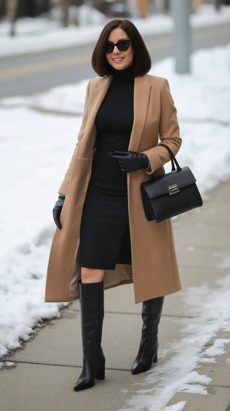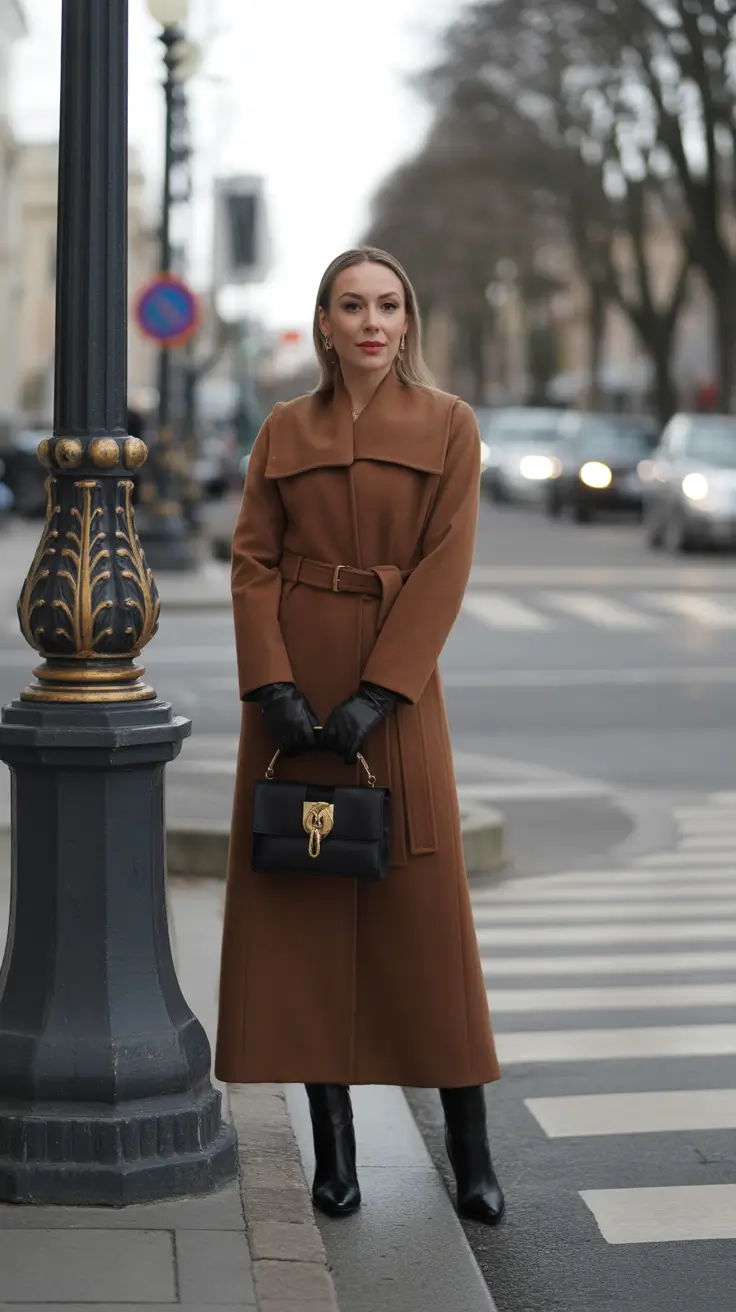 The long cocoa coat, belted at the waist, brings instant polish, while the black turtleneck, sleek gloves, and mid-heel knee-high boots shape a confident, uninterrupted column. The coat’s belt is the secret weapon—pinches the waist so the coat doesn’t swallow the frame. A structured, top-handle bag adds final flair, exuding understated class that feels perfectly at home on dreary gray mornings.