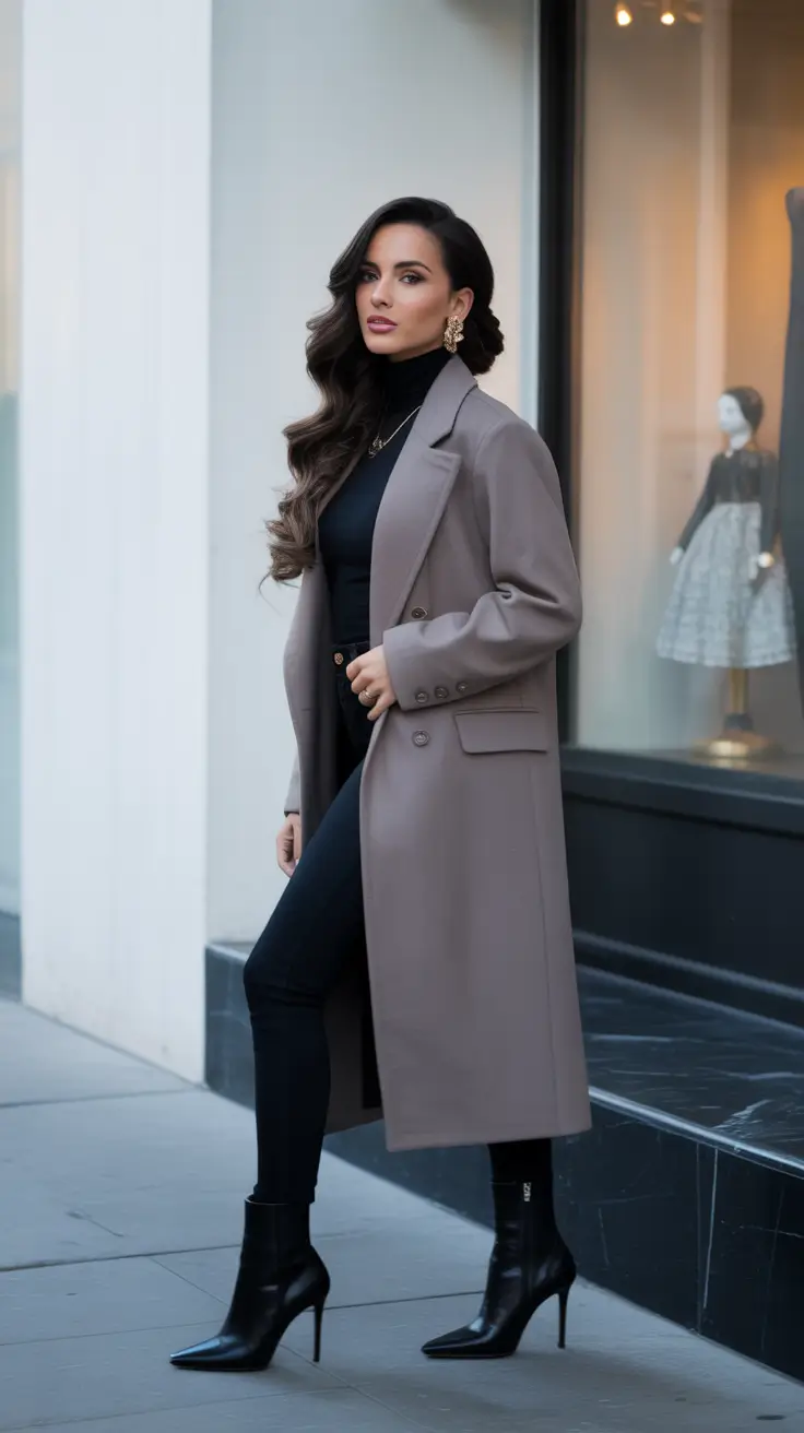 A crisply tailored taupe coat sits over a simple black turtleneck and skinny trousers. It’s the cheat sheet to chic: elongates the legs, shrinks the waist, stuns at work or dinner. Stiletto ankle boots finish the lift, while those dramatic long lapels add an extra lift in the height department. Sip of glint? Drop on gold statement hoops and a whisper-thin layered necklace, and you’re unmistakably dressed to the nines yet chic enough for everyday.