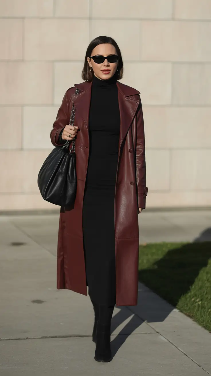 A merlot-hued wool coat takes center stage, the kind you just hang up and the room changes temperature. Sharp lapels, structured shoulders, and a taut belt carve the waist. Directly beneath, a refined black turtleneck flows into matching leather gloves. They tuck into sharp ankle boots, turning the line on body. Sliding on cat-eye shades and geometric earrings, you feel poised. Accessories feel generous but aren’t loud. This outfit calls itself “dressed-up” and proves it in real time. The kind of look where you leave the office, step into a gallery, and still fit right in, costume change be damned.