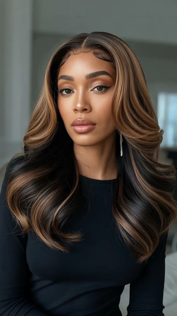 In this case it is the long, glossy waves, with a deep espresso base, caramel curtain pieces to soften the cheekbones. It is that salon freshness which illuminates a beige knit and candleskin. The positioning is excellent – coins of money near the front, wider ribbons in the middle-lengths – an age-old favorite in black women winter hair colors.