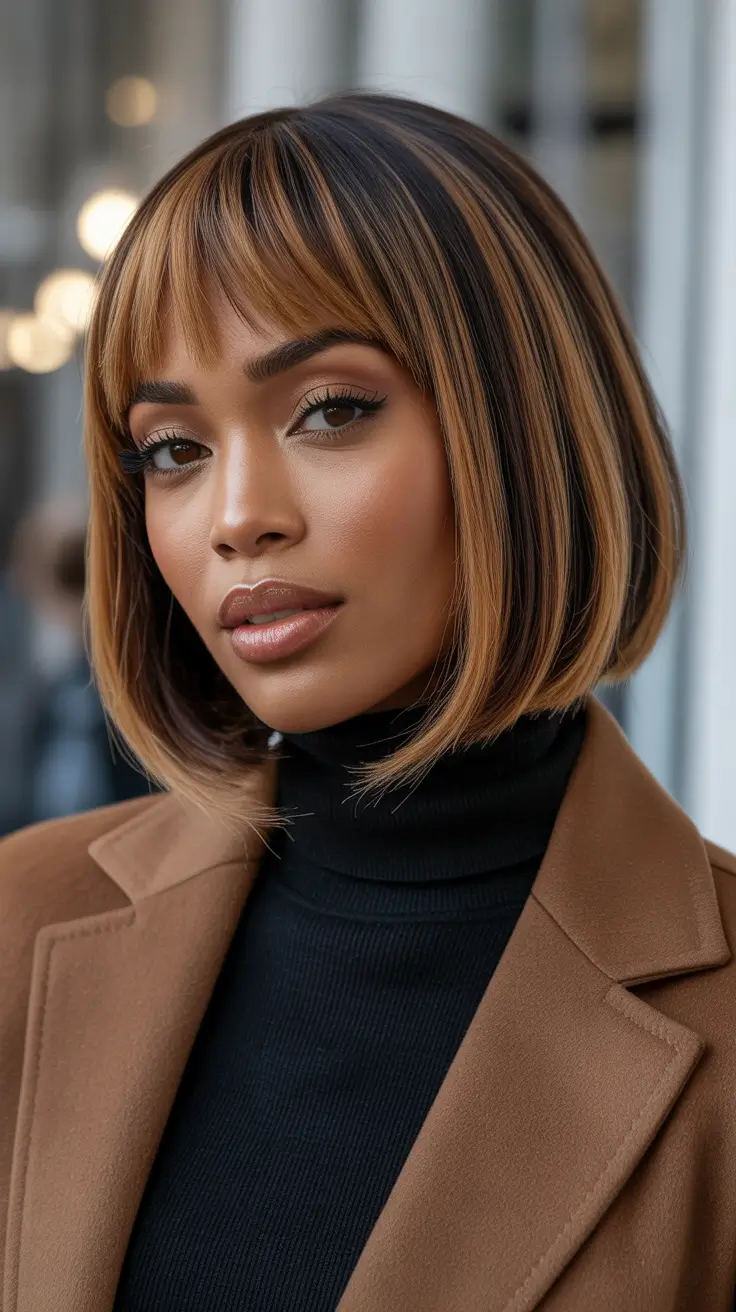 Soft-serve season, though cold-weather chic – this Milk tea Blonde lob combines a beige palette with light bangs, which brush past the brows. It is neutral to slightly warm, and that has been flattering to much of the undertones and completely on the Inspo boards to winter hair colors of black women in 2025 and beyond. I adore the way the ends bevel in on the plush, sweater finish.
