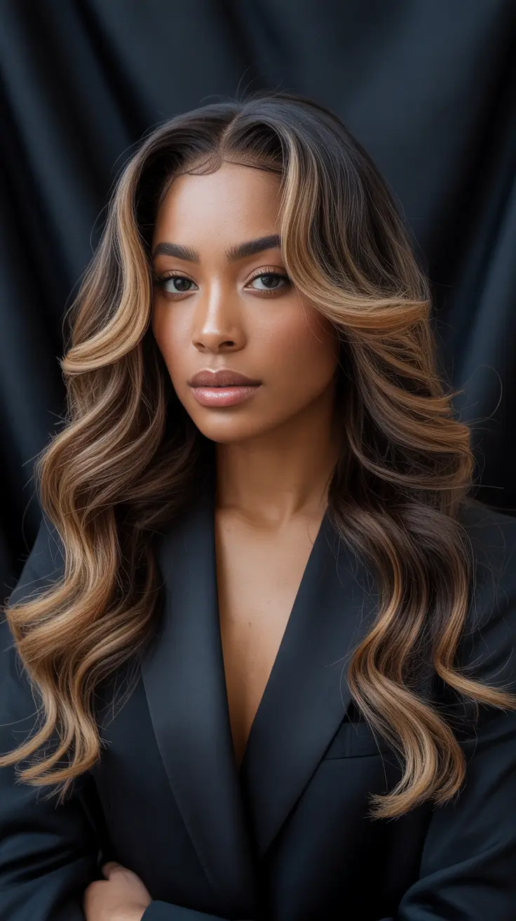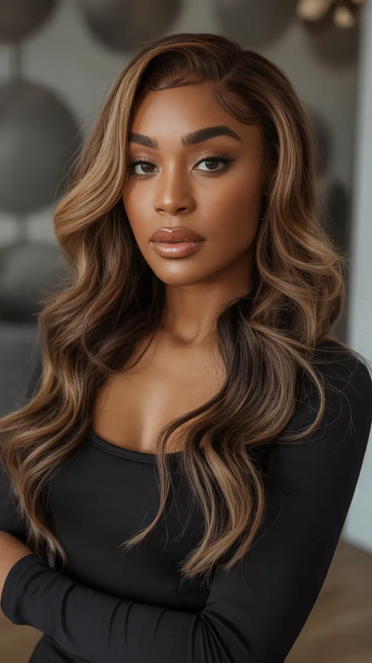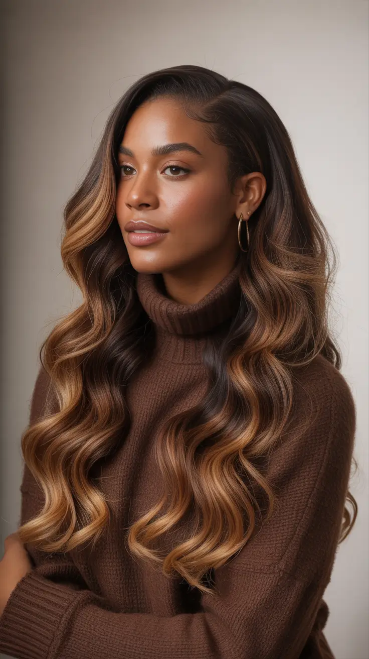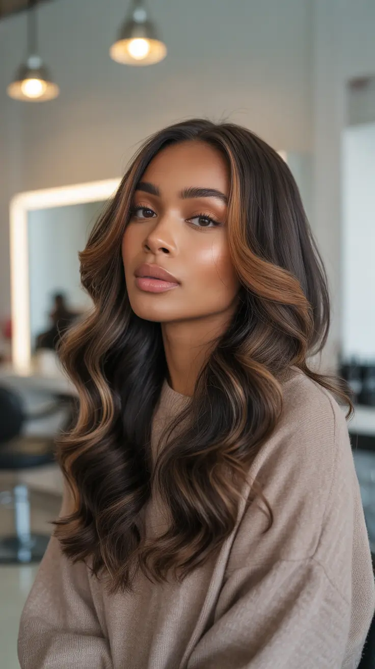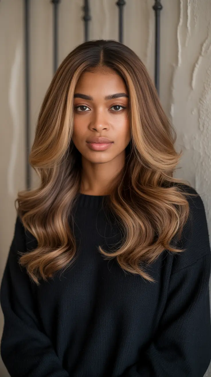 Ribboned caramel lights are met by soft coffee tones and I am obsessed. The base exists in a shinny Brunette world with a twist of Chocolate and the balayage lightens the mids and ends to receive winter window light. When considering the top fall/winter hair colors black women, this read is rich, sculptural, and softly luxurious – particularly to collarbone-down cuts.