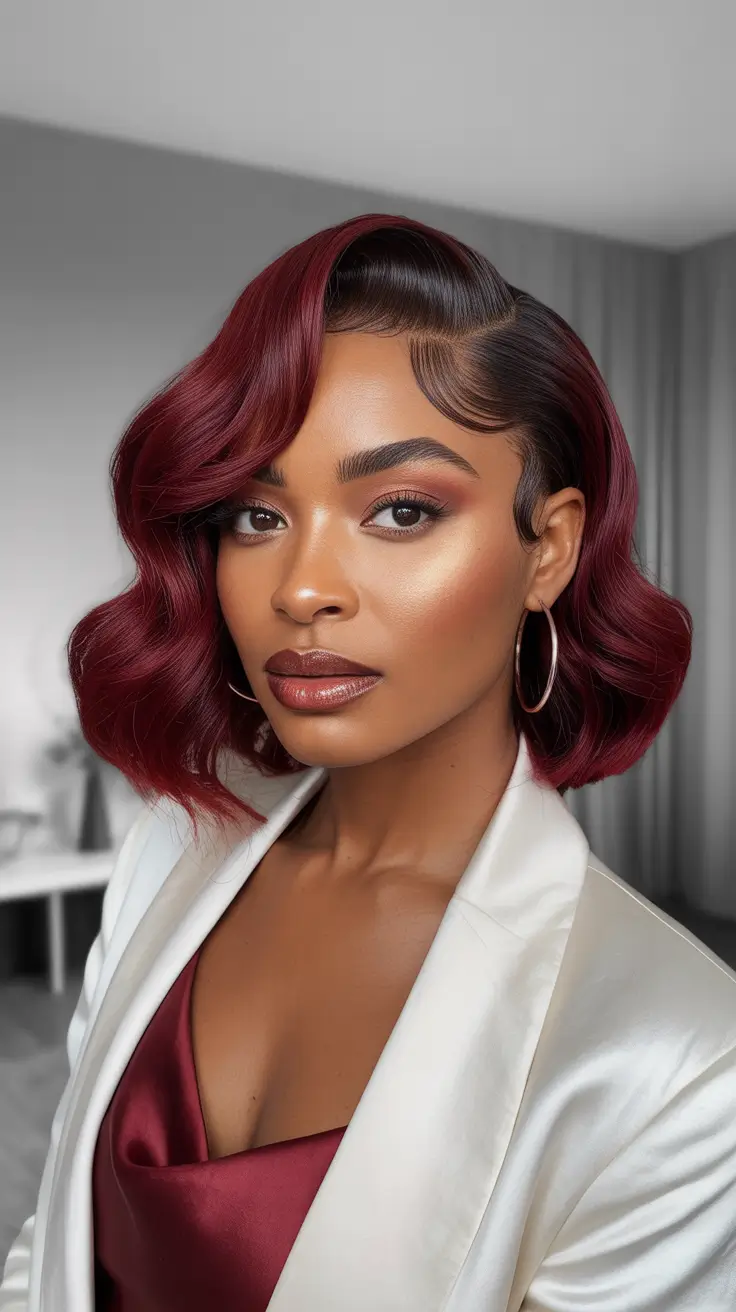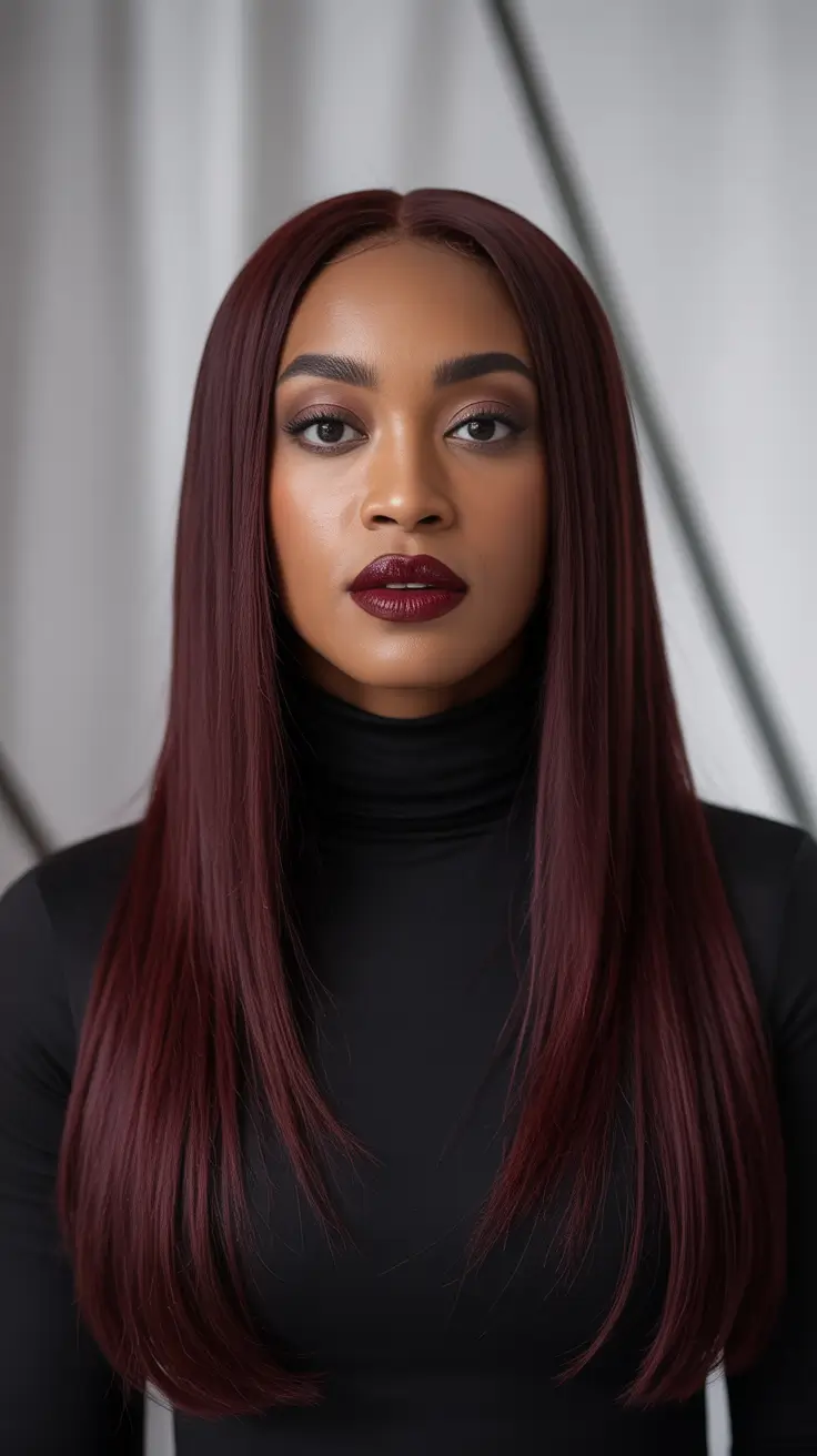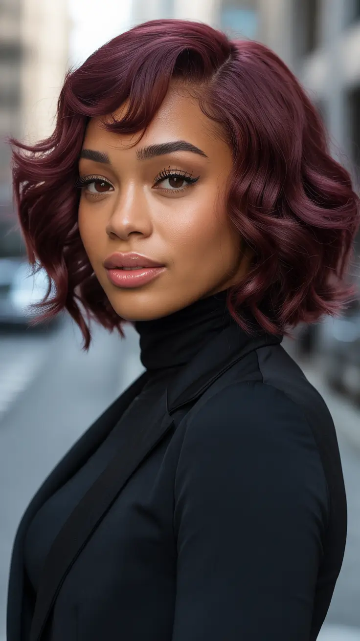 This brief, sculpted scene is dramatic, but quiet. Combine Black cherry with Dark red – a plush, wine-streaked color that will shine on cold skin and gold hoops will ring. This is a power move in case you love cute winter hair colors black women with a boardroom to date night vibe.
