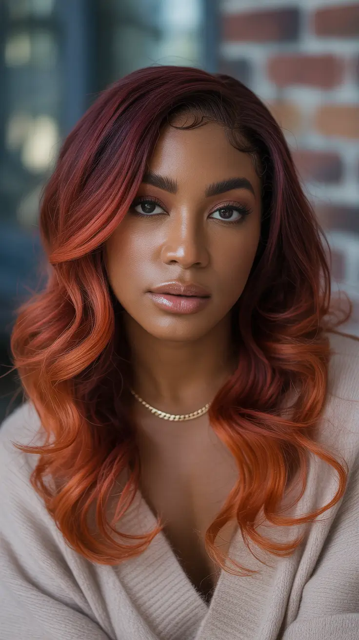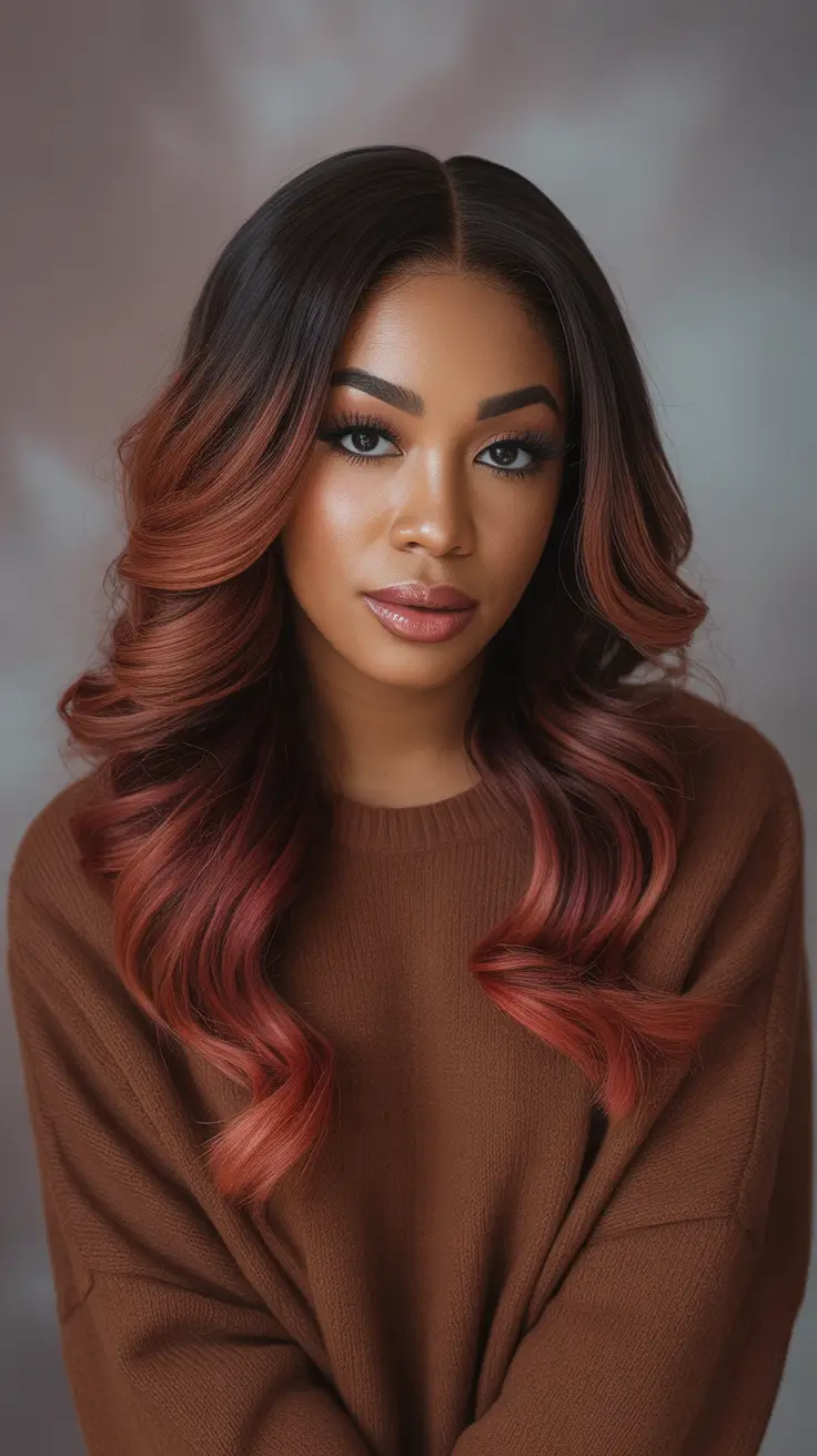 This would be cozy sweaters in a shade. There is a smooth transition of Auburn and Red starting with a crown tinged with berries and flowing to coppery ends to give you movement without even having to pick up a curling iron. It is daring but makes great winter hair colors on dark skin black women who want to be radiant, not orange.