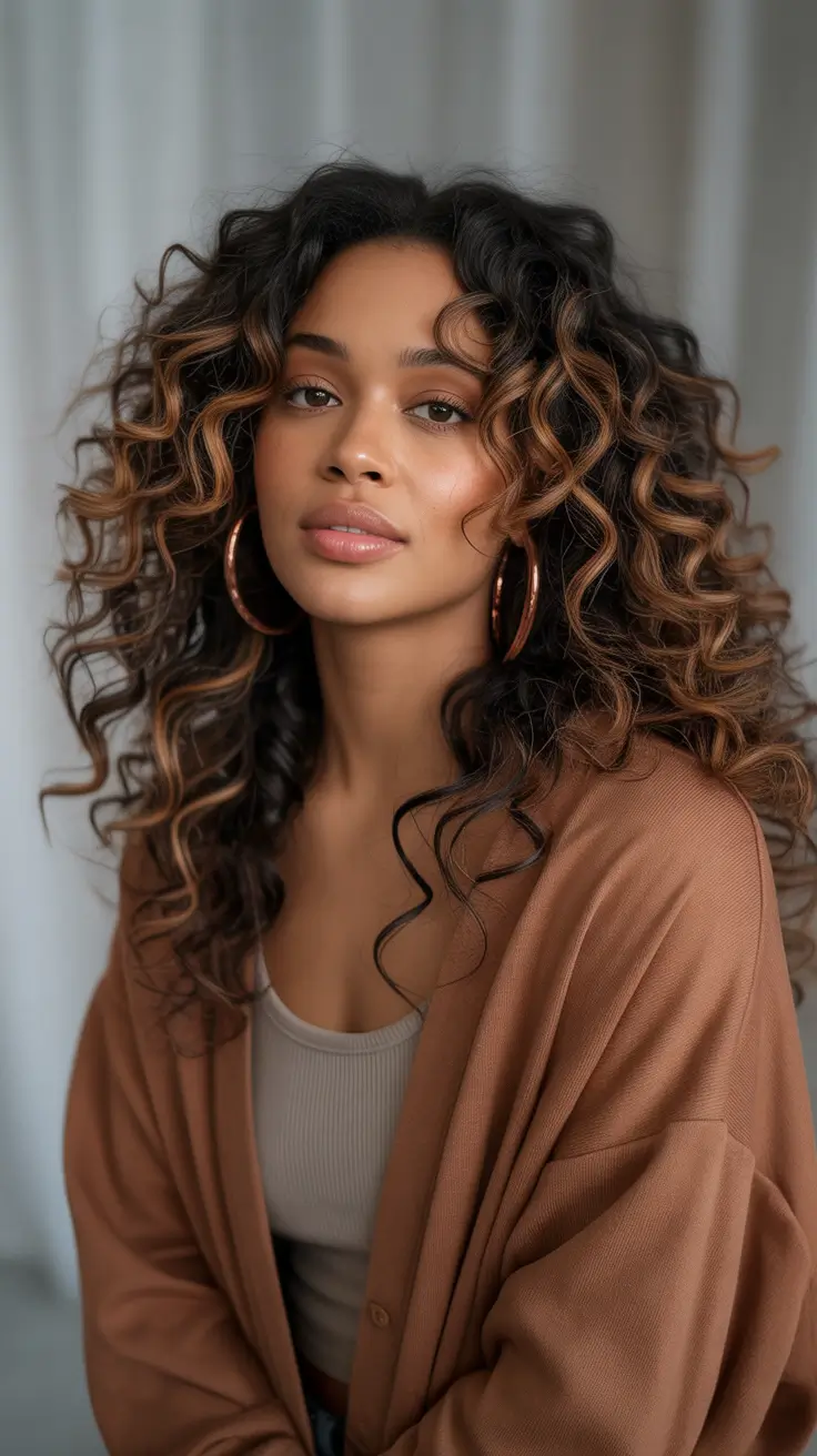 In the case of curls, the high-contrast pops are placed on top of texture as confetti – happy and flattering. To maintain the pattern of the coil I keep the root circular around the face and outer halo with pieces of honey and toffee. The outcome is vivacious, tender, and frolicsomee over a camel cardigan – a charming version of what winter hair colors on black women natural should look like.