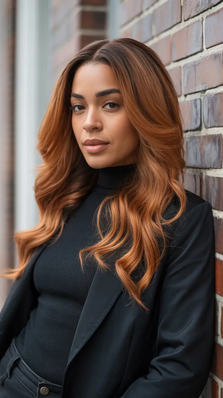 The chill comes and I seek warmth at once – this warm auburn softness like candles on long sleek tresses. The foundation is deep Brunette with stripes of toasted Auburn and caramel which brush the cheekbones and through the ends and which have that sparkling swing that everyone desires in December. When you are in search of winter hair colors on dark skin black women, this warmth is brightened without appearing brassy, particularly in grey skies. It is totally comfy and a bit glam which is my niche.