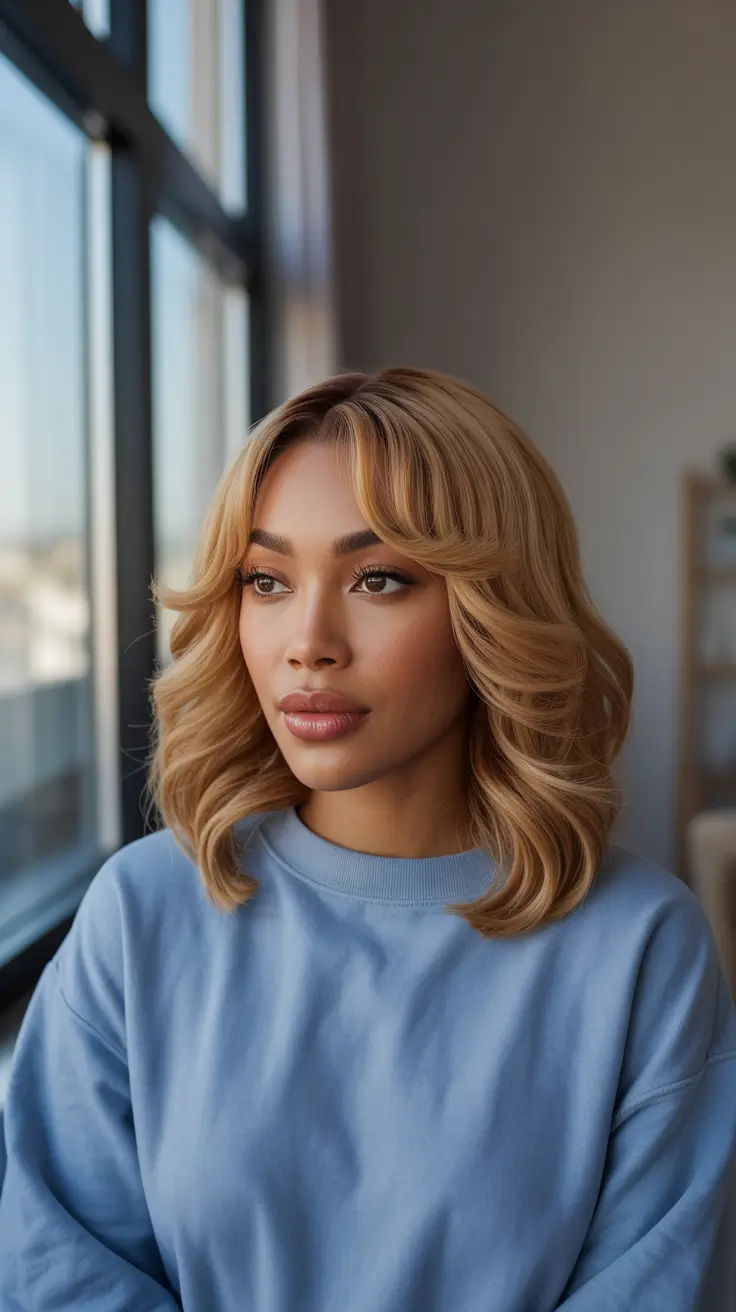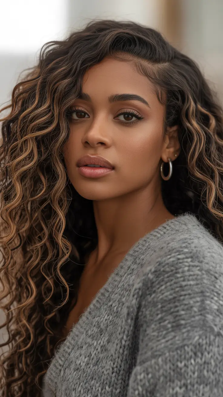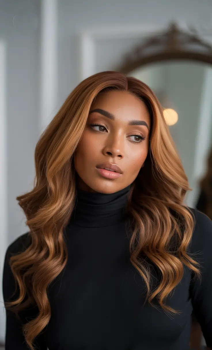 As I am in need of brightness but not full blonde, I pick up bronde, with a sunlit money piece. The center is a balanced Brunette that fades off into honey Blonde paneling on the face – the curl pattern does the rest, adding glossy movement, which is weekend ready but office safe. It belongs to the sweet category of fall /winter hair color black women that says luxe in any light.