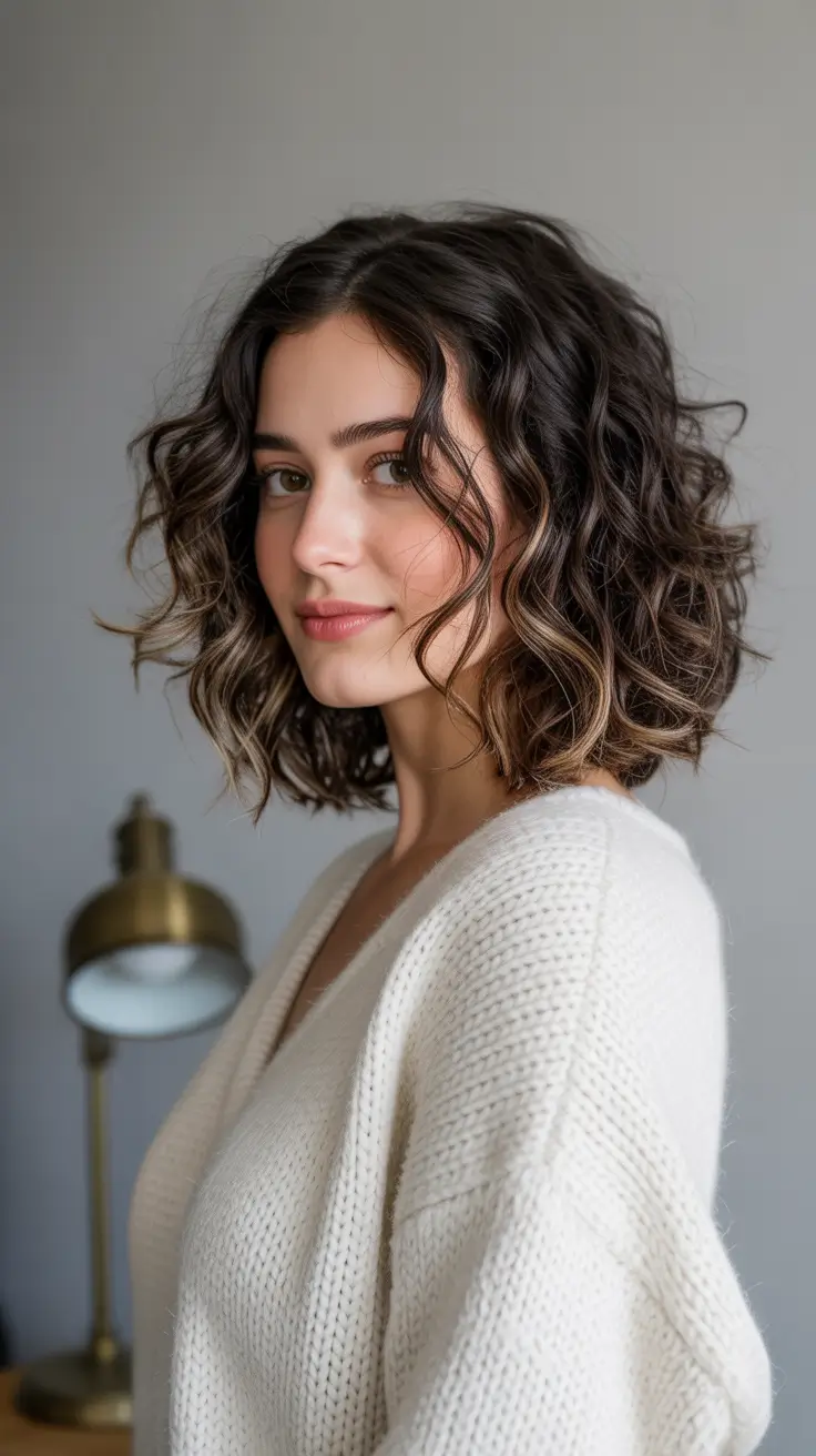 A springy, chin-skimming bob painted in soft cocoa, with pale vanilla ribbons barely curling along the tips. Dunked in a knitted cardigan and a loose V-neck, the look stays snug; the subtle balayage feels brightened, not bright, like fairy lights blinking on skim milk.