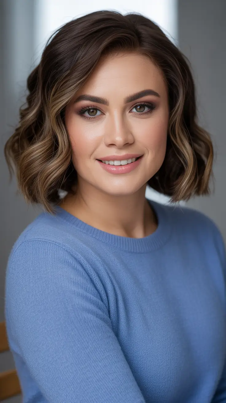 On cold mornings, this is my go-to hairstyle: a chin length bob with soft internal layers along with wide, shiny waves that extend beyond the cheekbones. The shape is kept compact with the darker chocolate base color and subtle cocoa ribbon highlights. The side part adds a lengthening illusion. It’s flattering for winter haircuts for round faces because the short bob doesn’t feel harsh. The hair is light and elegant.