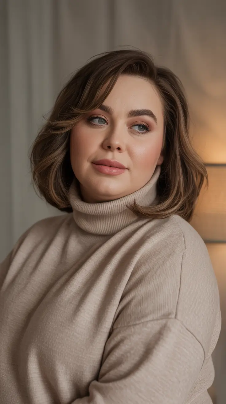 This style is all about movement, a softly beveled bob with a side swoop front, silky ends hitting the collar, and volume at the crown and just under the jaw. Keeping the mid-face neat is ideal for the winter haircuts for round faces medium length category. This style is classic and calm, with no bulk even under a chunky roll-neck sweater.