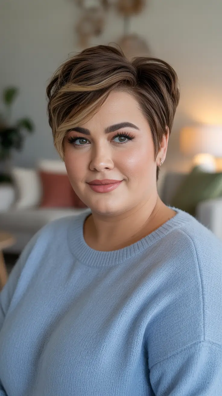 The Loose bends and softly Layered Jaw length Bob is the perfect winter short hairstyle to give a slight lift. It sits high enough to avoid bulky knits and the wavy texture adds movement and counterbalance to the roundness. Copper adds warmth on a cloudy day and the side sweep adds gentle asymmetry. It gives off the best vibe of “throw on a chunky sweater and look done” – ideal for those who want to add a touch of winter to their haircuts for round faces.